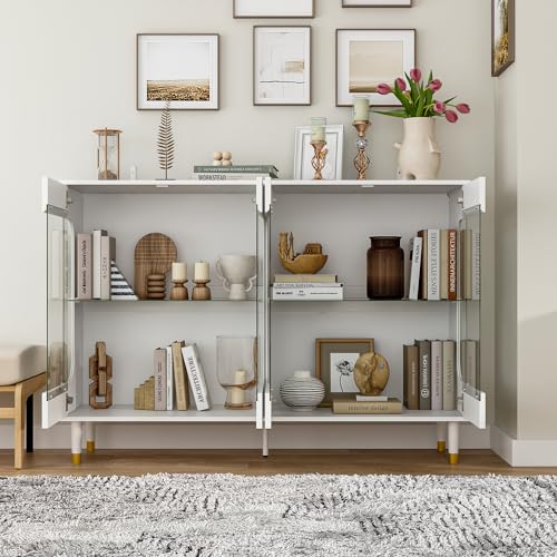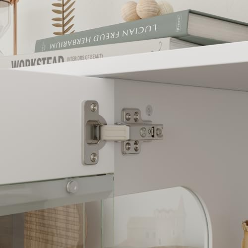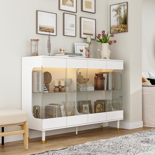 Hitow Lighted Curio Cabinet Storage Cabinet with Glass Doors, Wooden Dispaly Cabinet with 3-Color LED Light, 55.1" Long Buffet Cabinet for Home Office Living Room Kitchen, White Type A