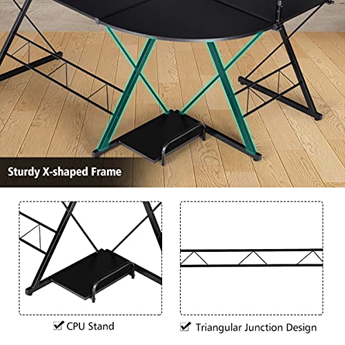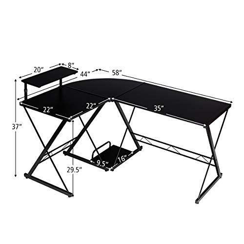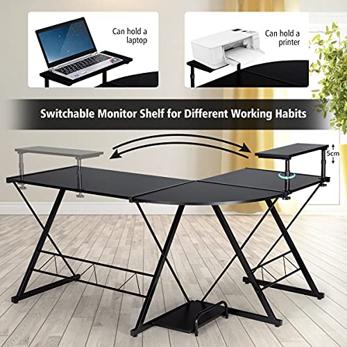 POWERSTONE L Shaped 58" Work from Home Computer Desk, Rustic Writing Office Workstation, Corner Curved Gaming Table with Monitor Stand and Storage Shelve