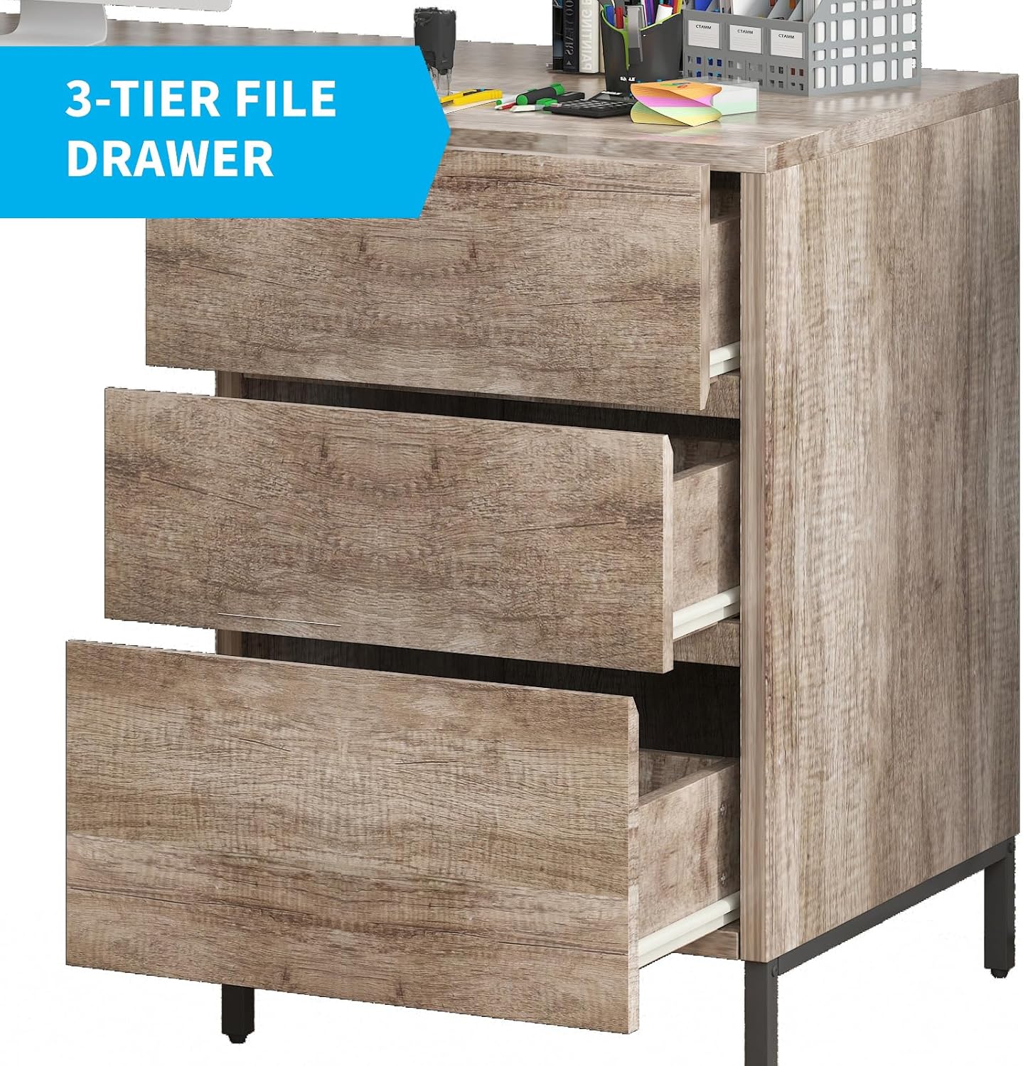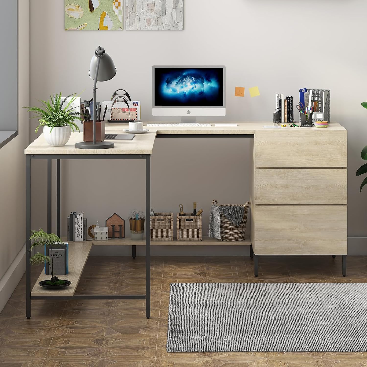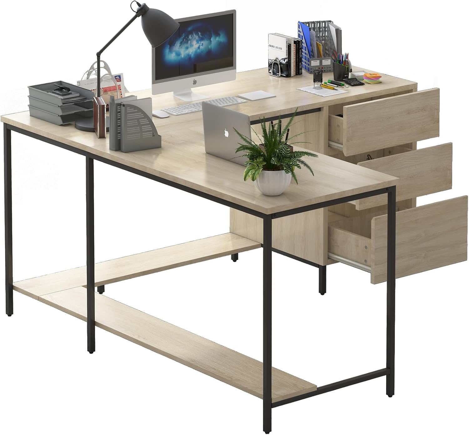 Mjkone 64” L Shaped Computer Desk, Office Desk with Three-tier File Drawer, Modern Corner Gaming Desk, Large Home Office Desk Writing Study Table Workstation, Rustic Oak