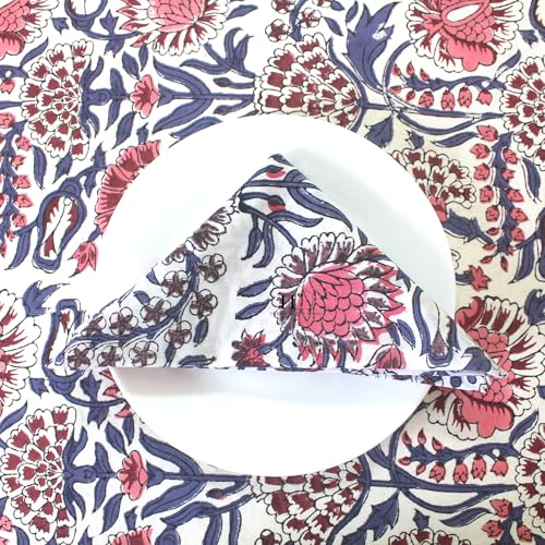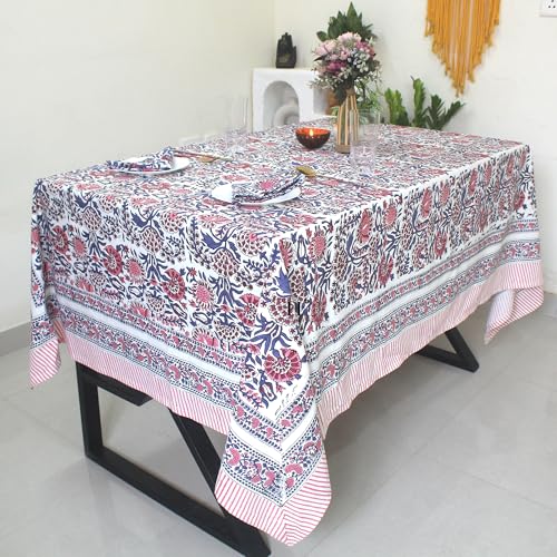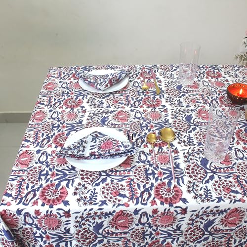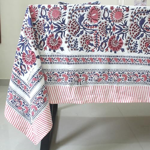 Floral Hand-Block Minimalist Cotton Tablecloth, Rustic Waterproof Table Cloth Dining Table Cover Farmhouse Party Home Kitchen gift All Sizes (4 seater 60x60 inch without napkins)