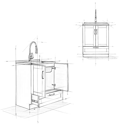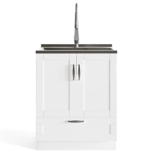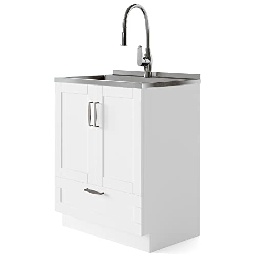 SIMPLIHOME Lawrence Transitional 28 Inch Laundry Cabinet with Faucet and Stainless Steel Sink in White, For the Laundry Room and Utility Room