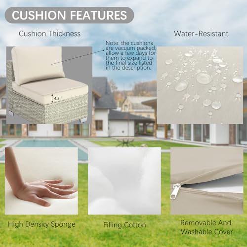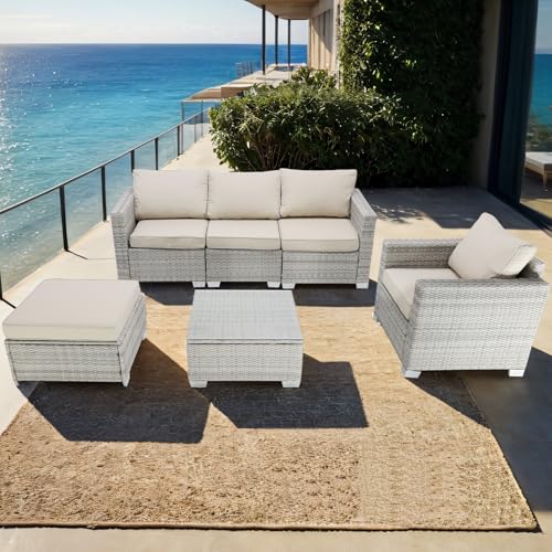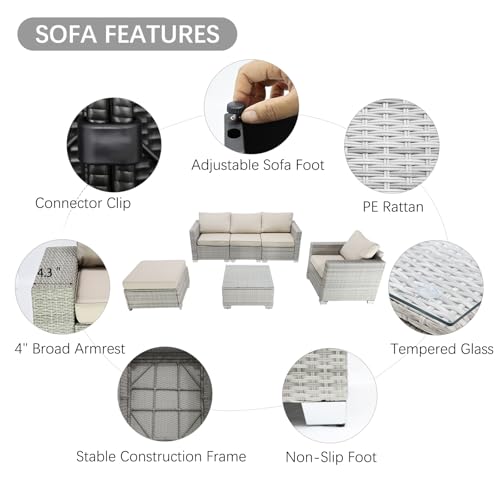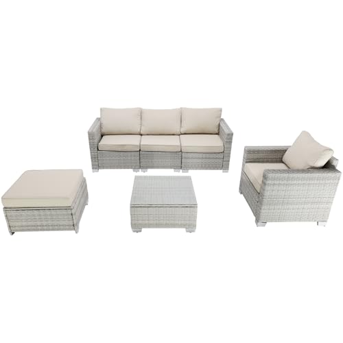 7 Piece Patio Furniture Set, All-Weather Wicker Outdoor Conversation Set with Sectional Sofa, Rattan PE Wicker Seating, Glass Coffee Table, and Cushions (Coffee-Red, Z7)