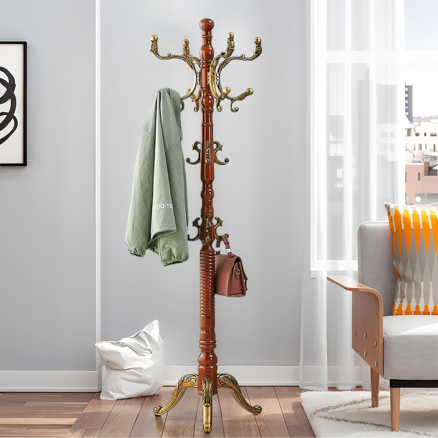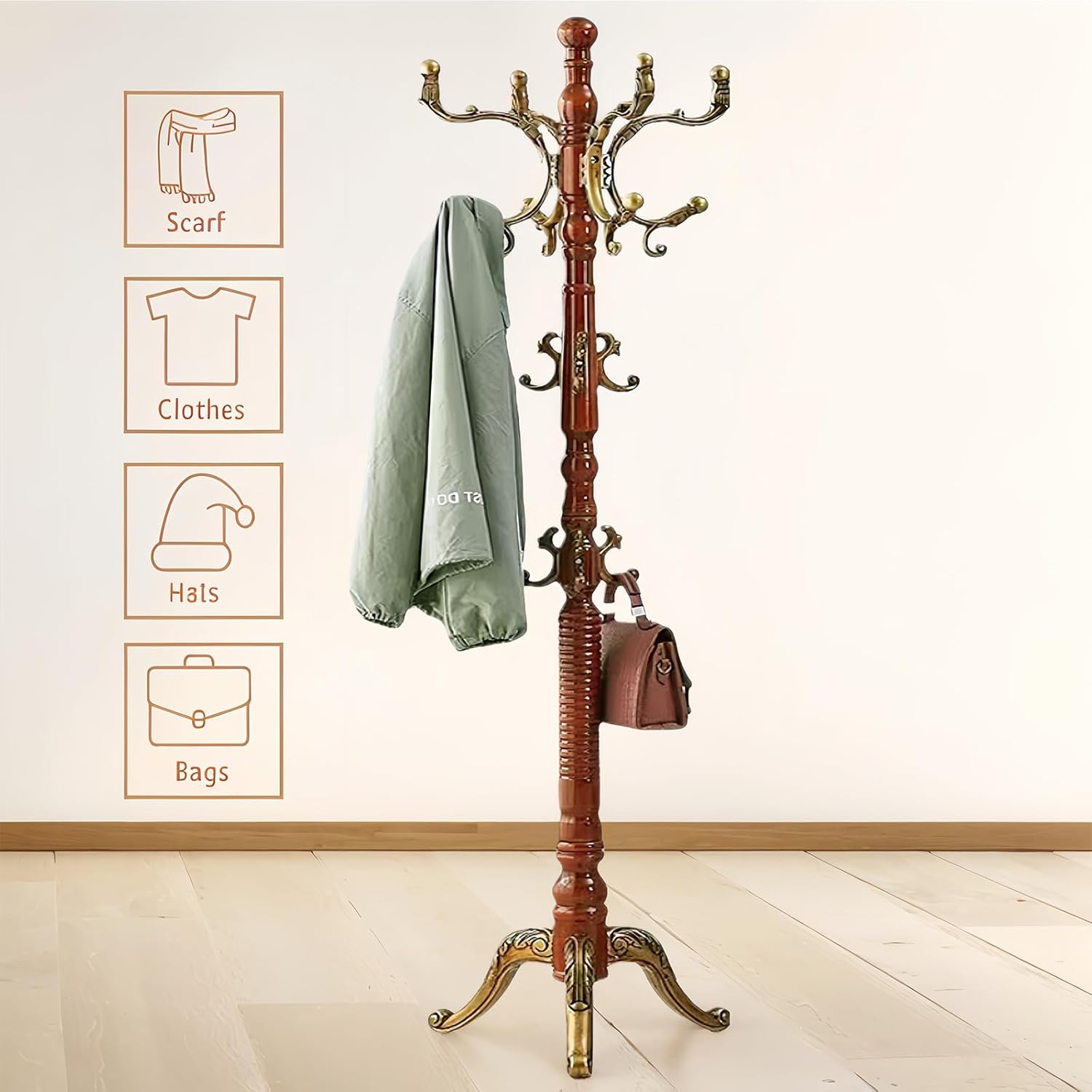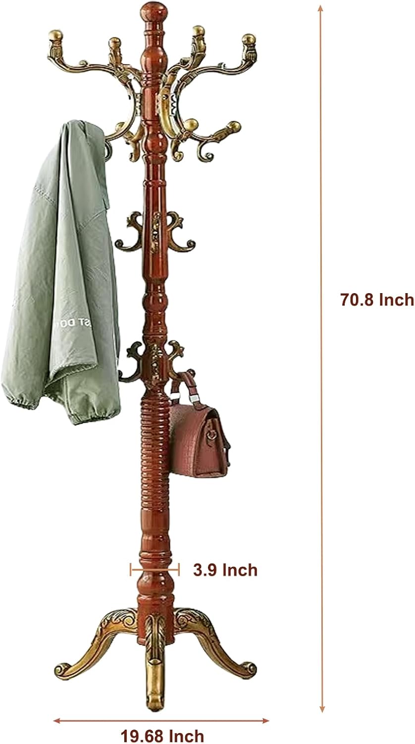 SEMIR Wood Coat Rack Natural Birch Entryway Coat Rack with 10 Hooks and Triangular Base Coat Tree to Hang Hats Jackets Bags Handbags