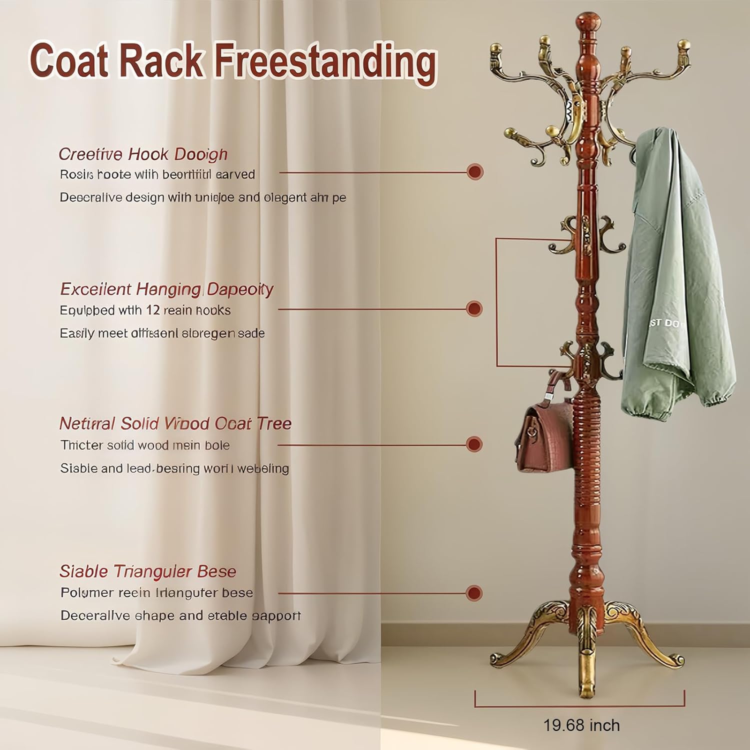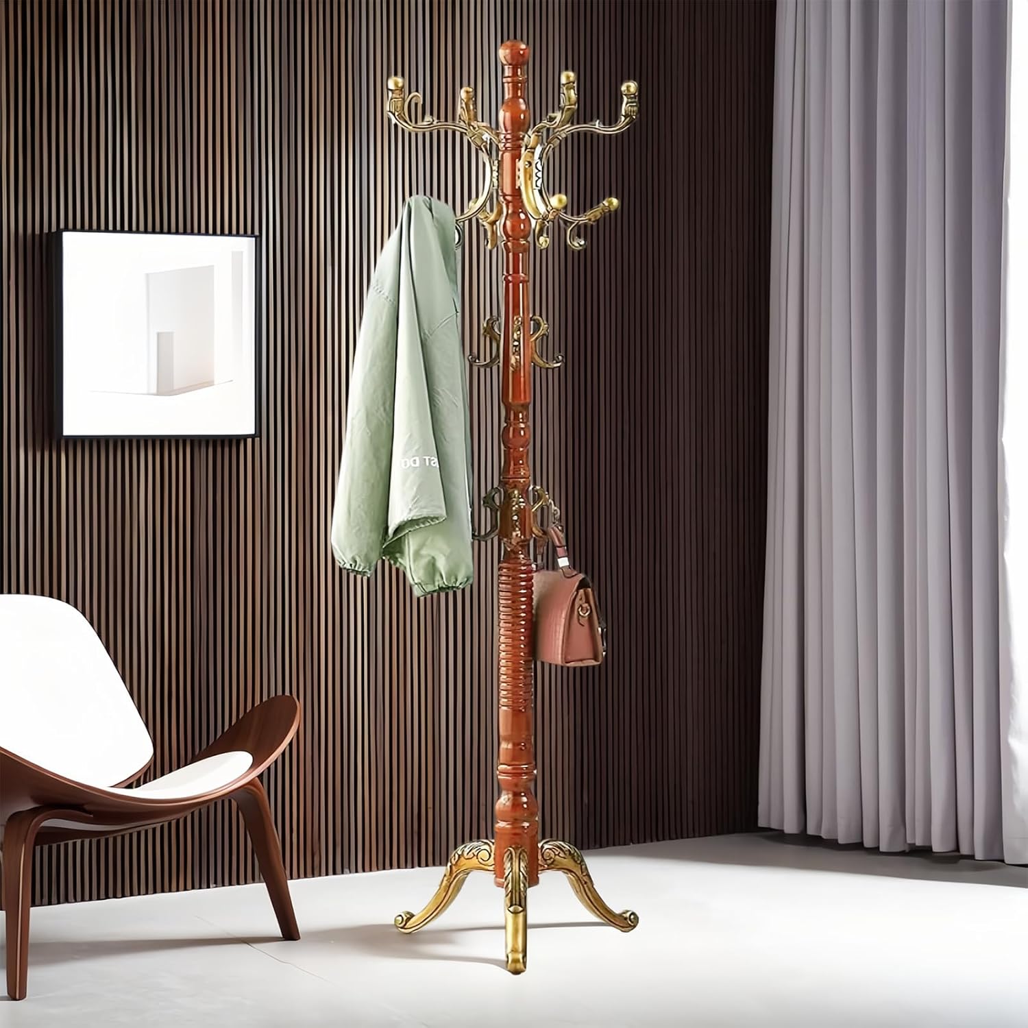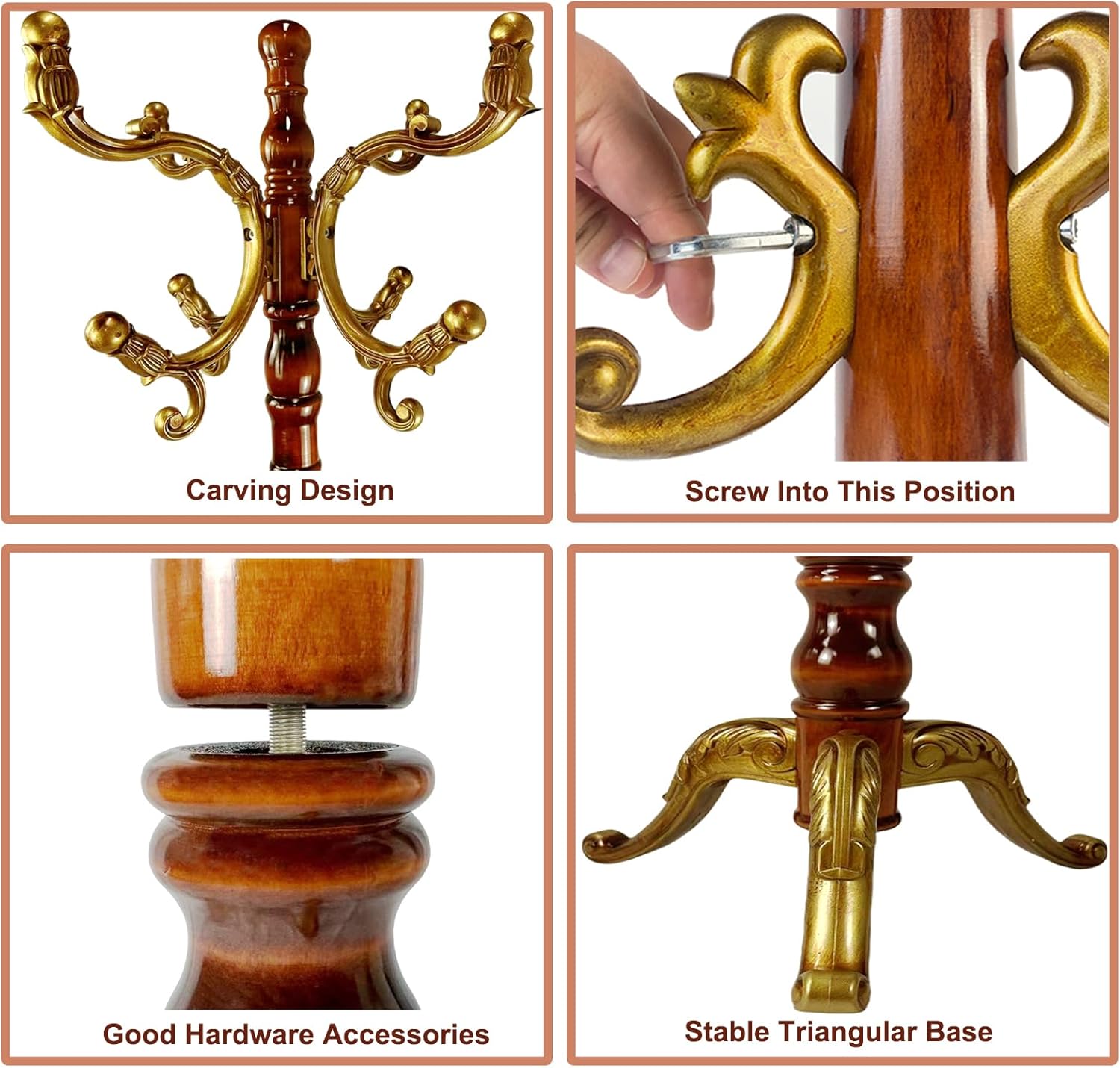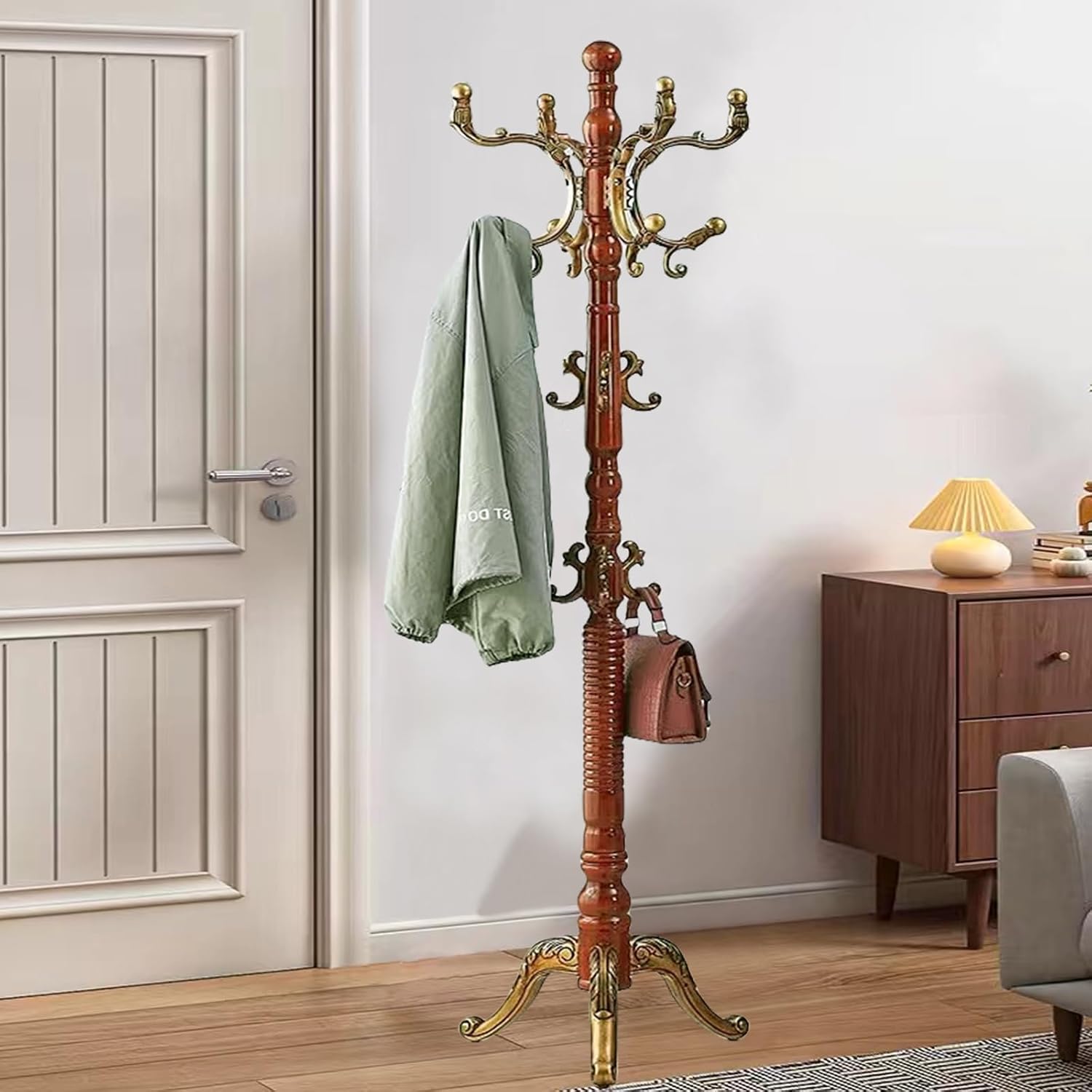 SEMIR Wood Coat Rack Natural Birch Entryway Coat Rack with 10 Hooks and Triangular Base Coat Tree to Hang Hats Jackets Bags Handbags