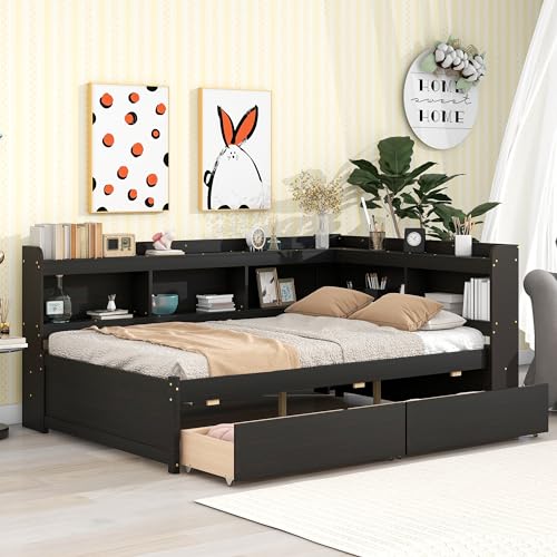 Bed Frame with Bookcase, Platform Bed Frame with Storage Full Size, Captain Full Size Bed Frame for Kids Teens Adults Bedroom, Wood Slats Support, No Box Spring Needed, Grey