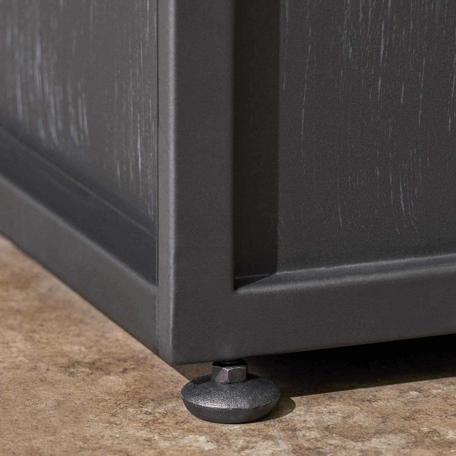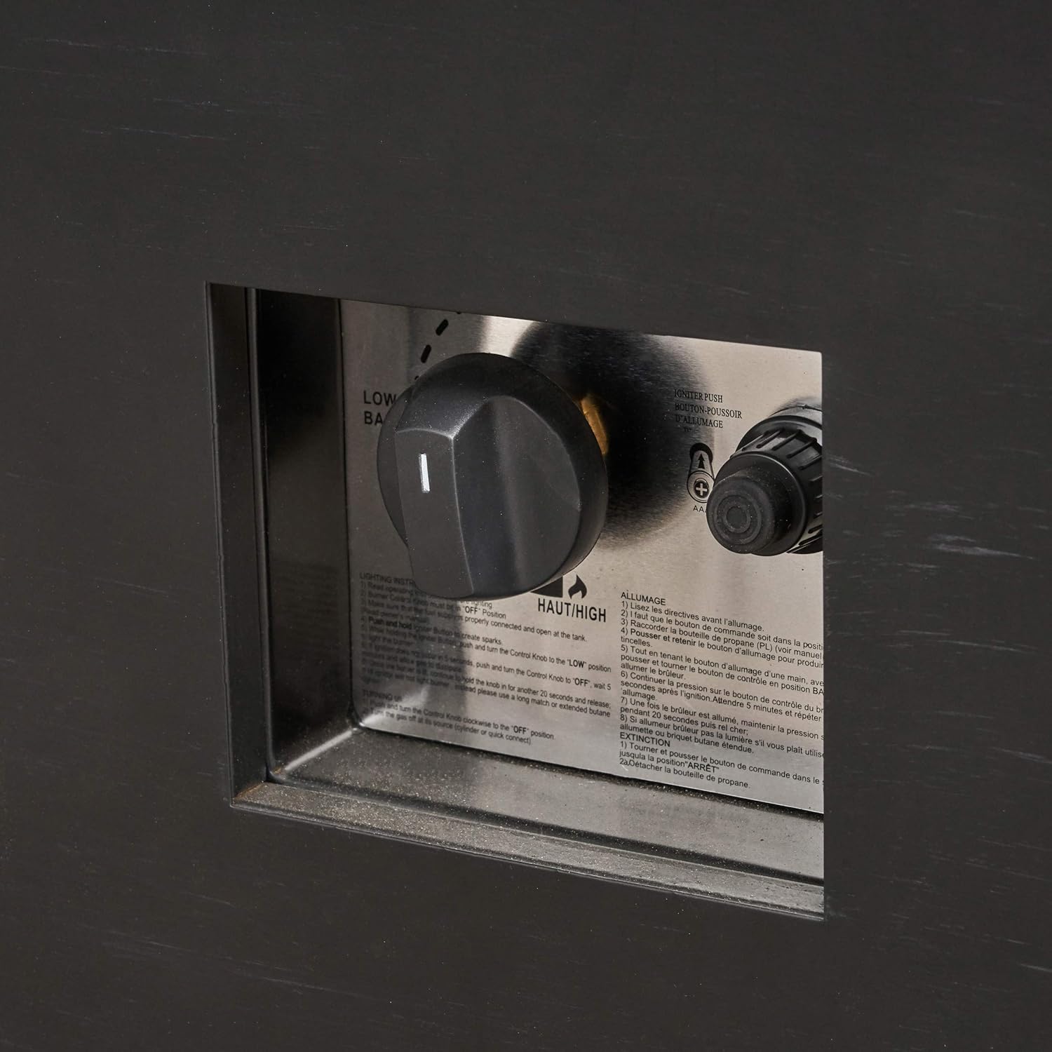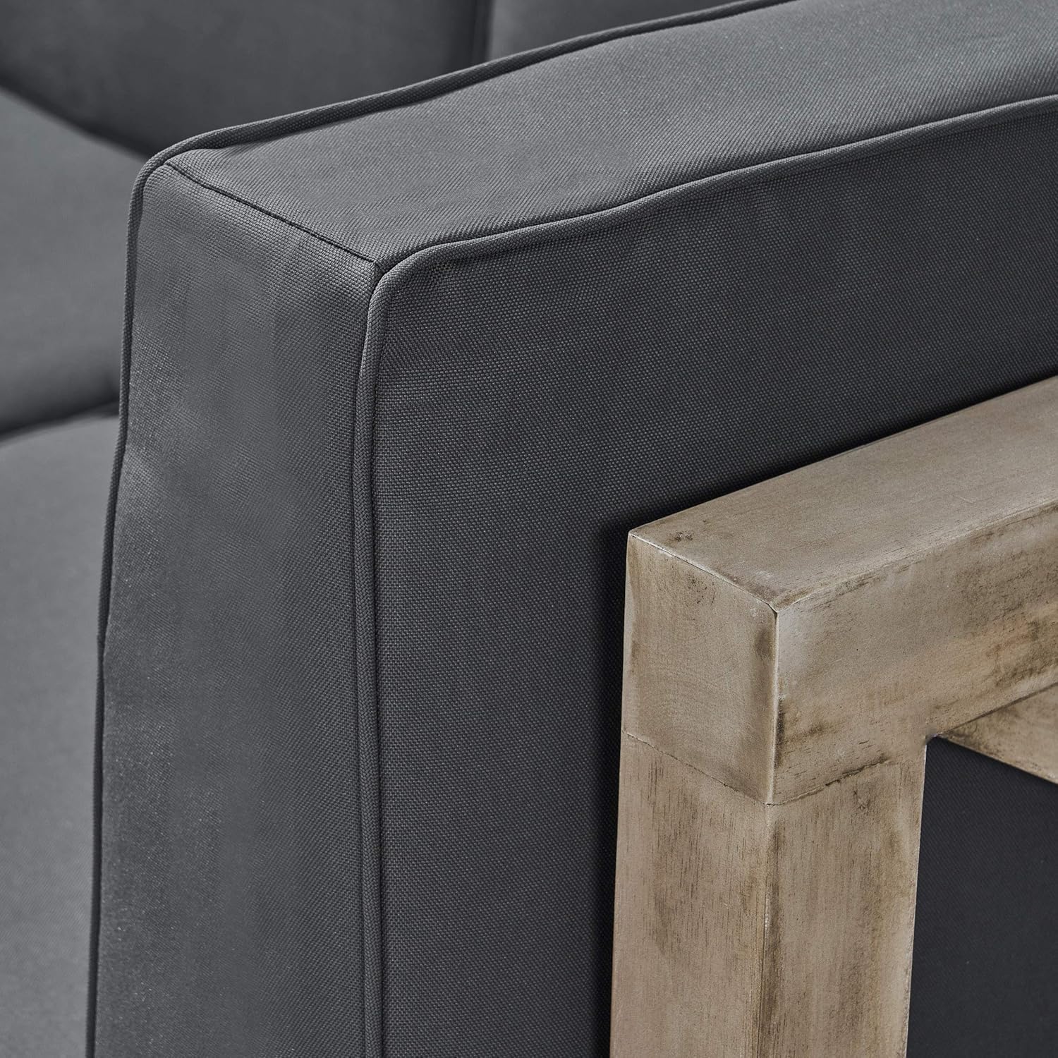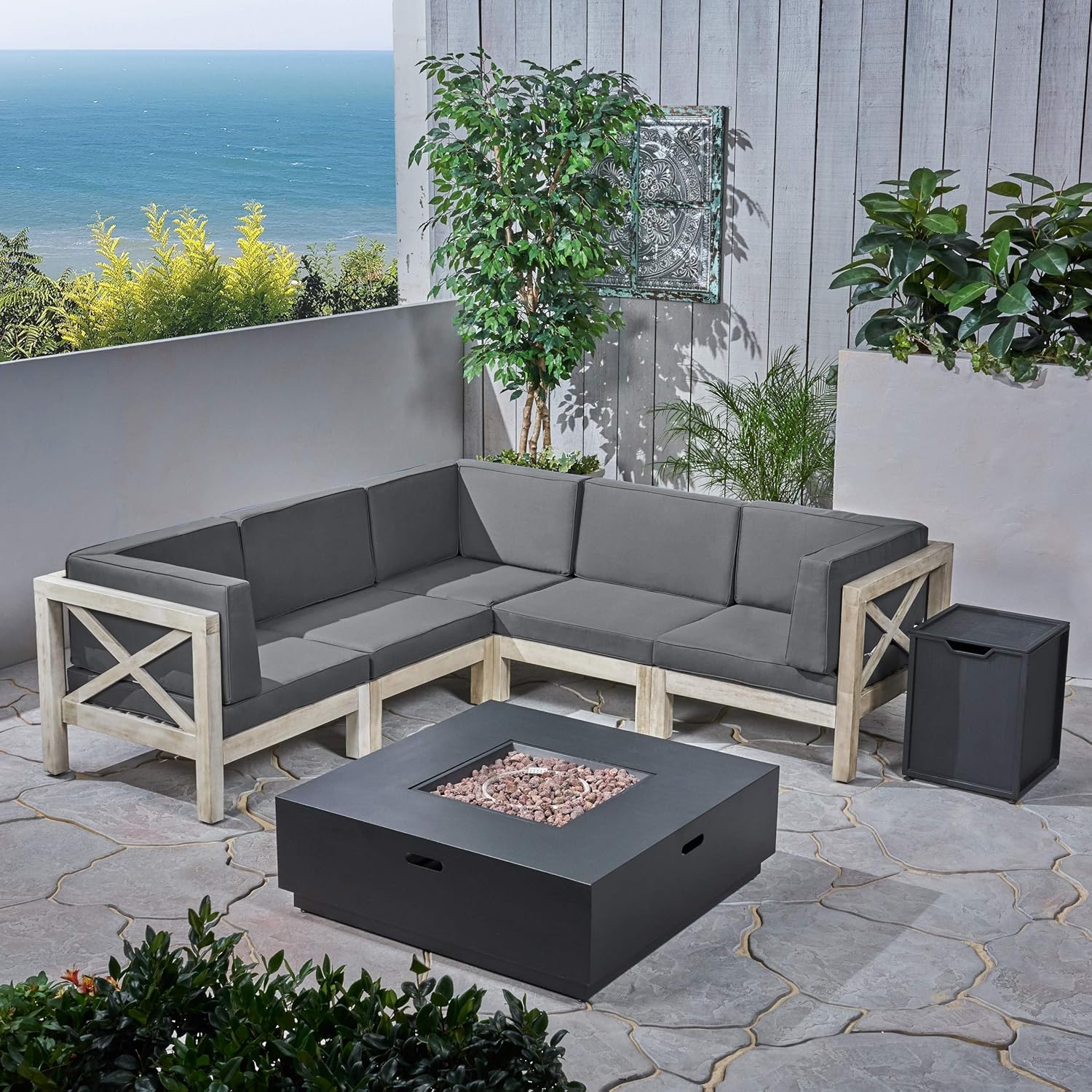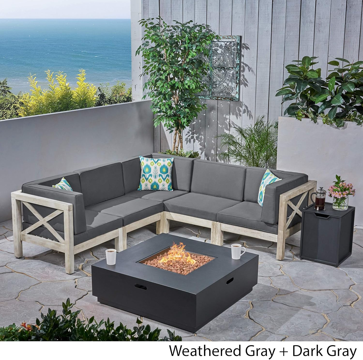 Great Deal Furniture Outdoor Acacia Wood 5 Seater Sectional Sofa Set with Fire Pit, Weathered Gray and Dark Gray