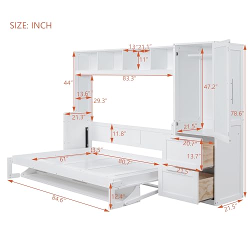 Queen Size Murphy Bed Wall Bed with Closet and Drawers, Wood Murphy Bed Wall Bed Folding Wall Bed with Storage Cabinet for Home Office or Small Room, White