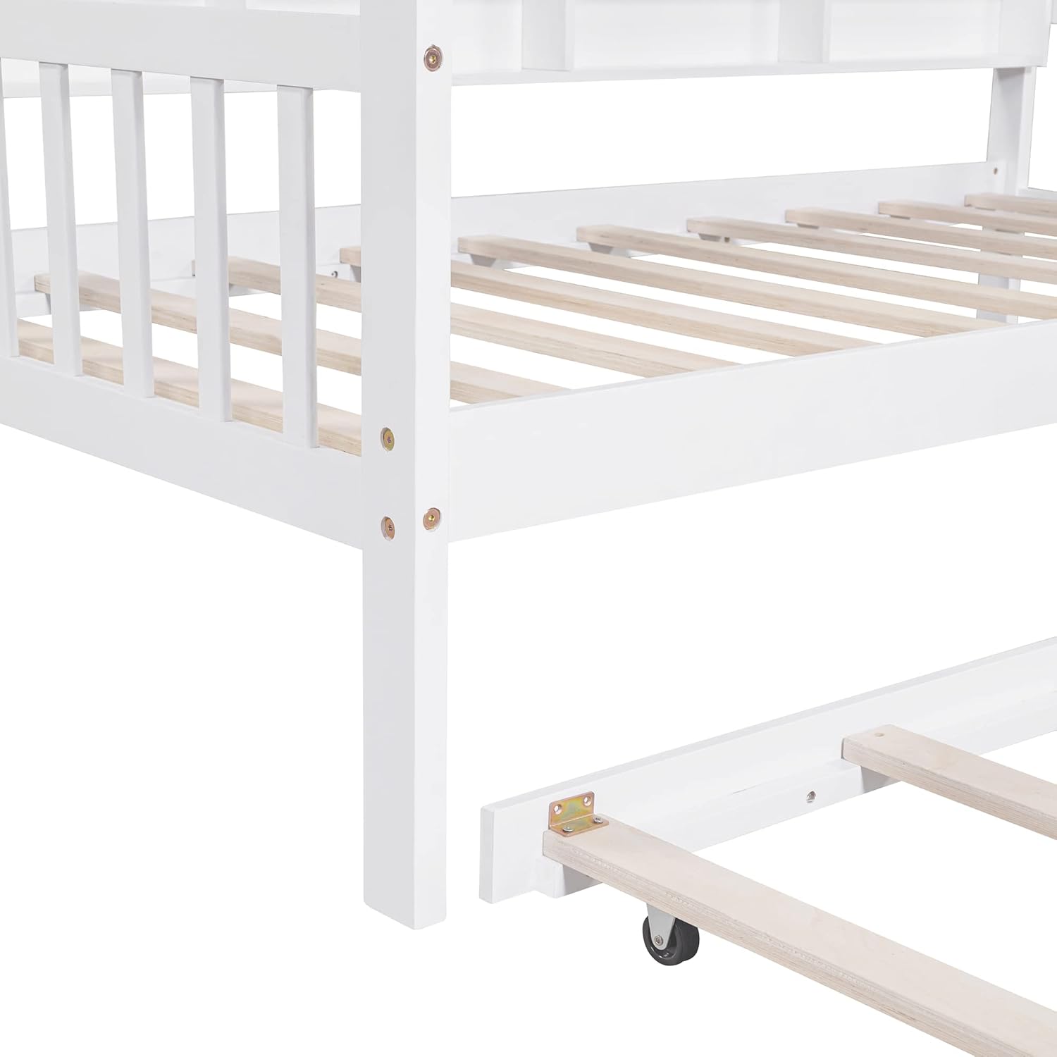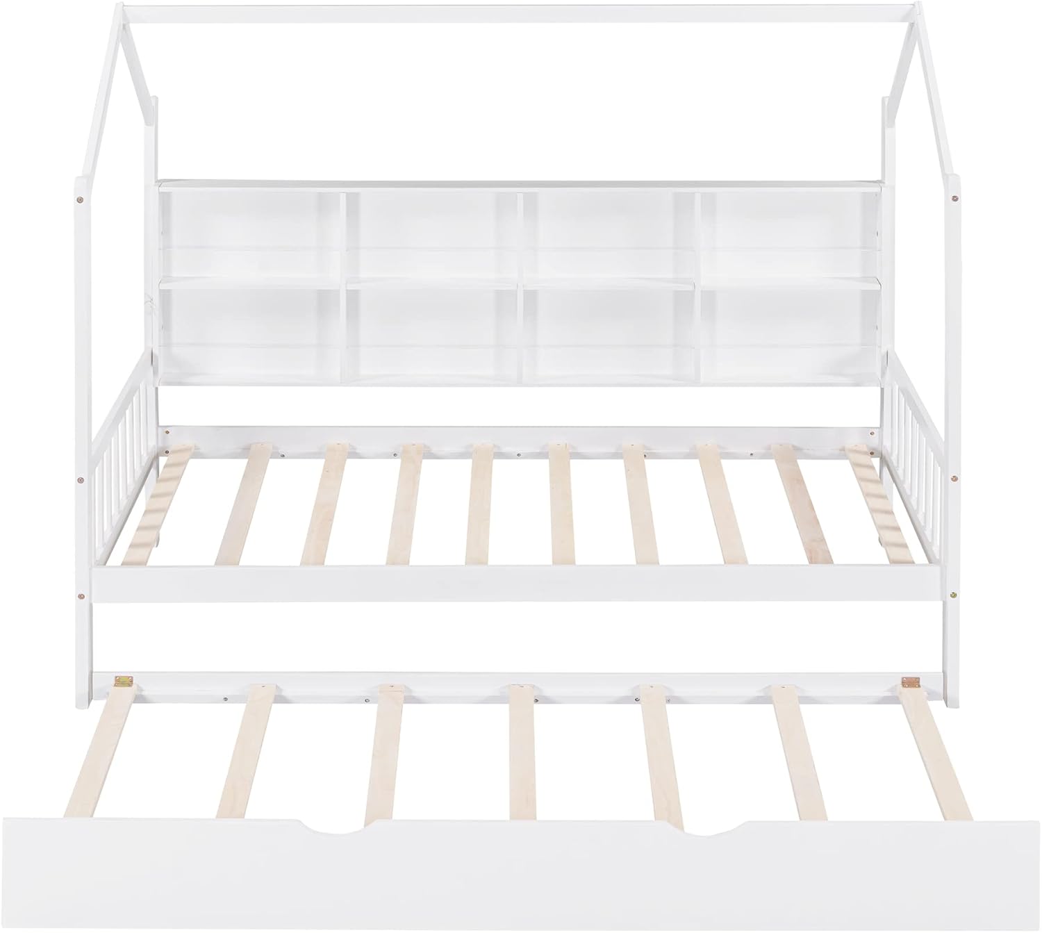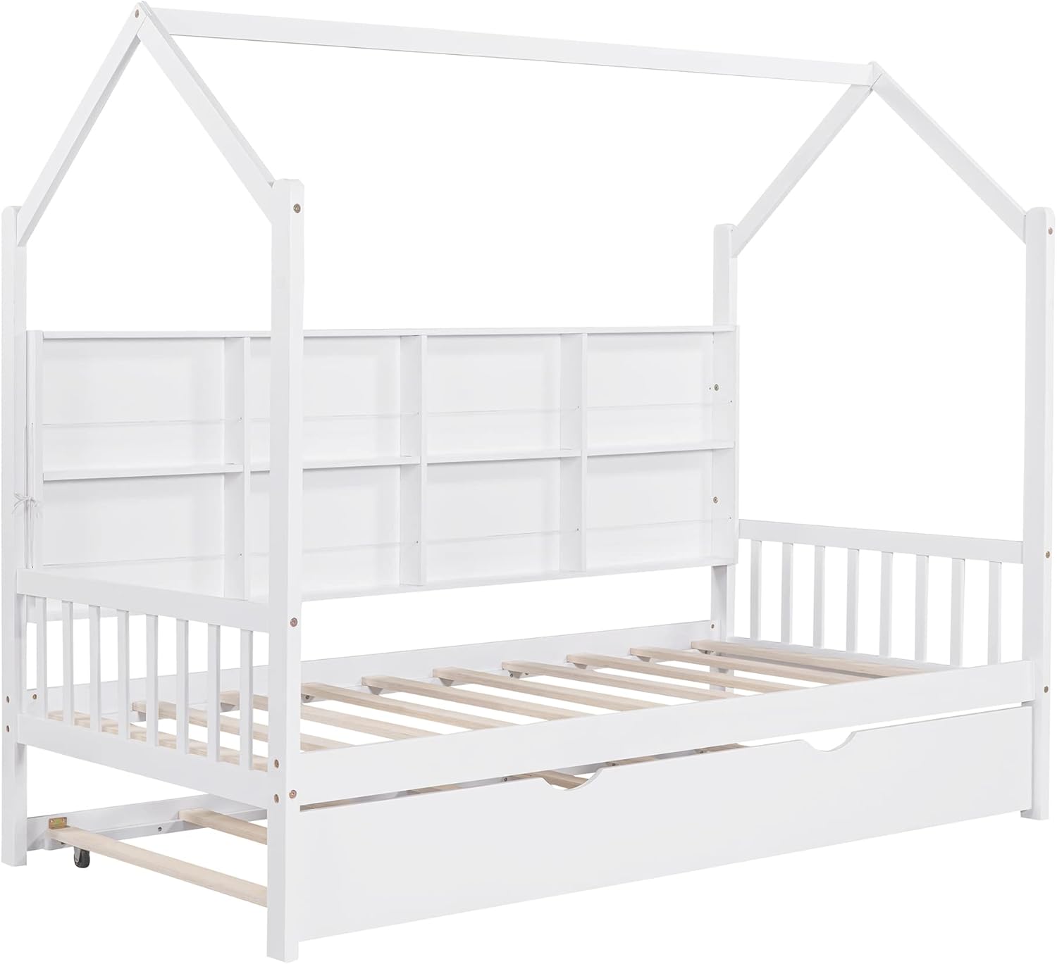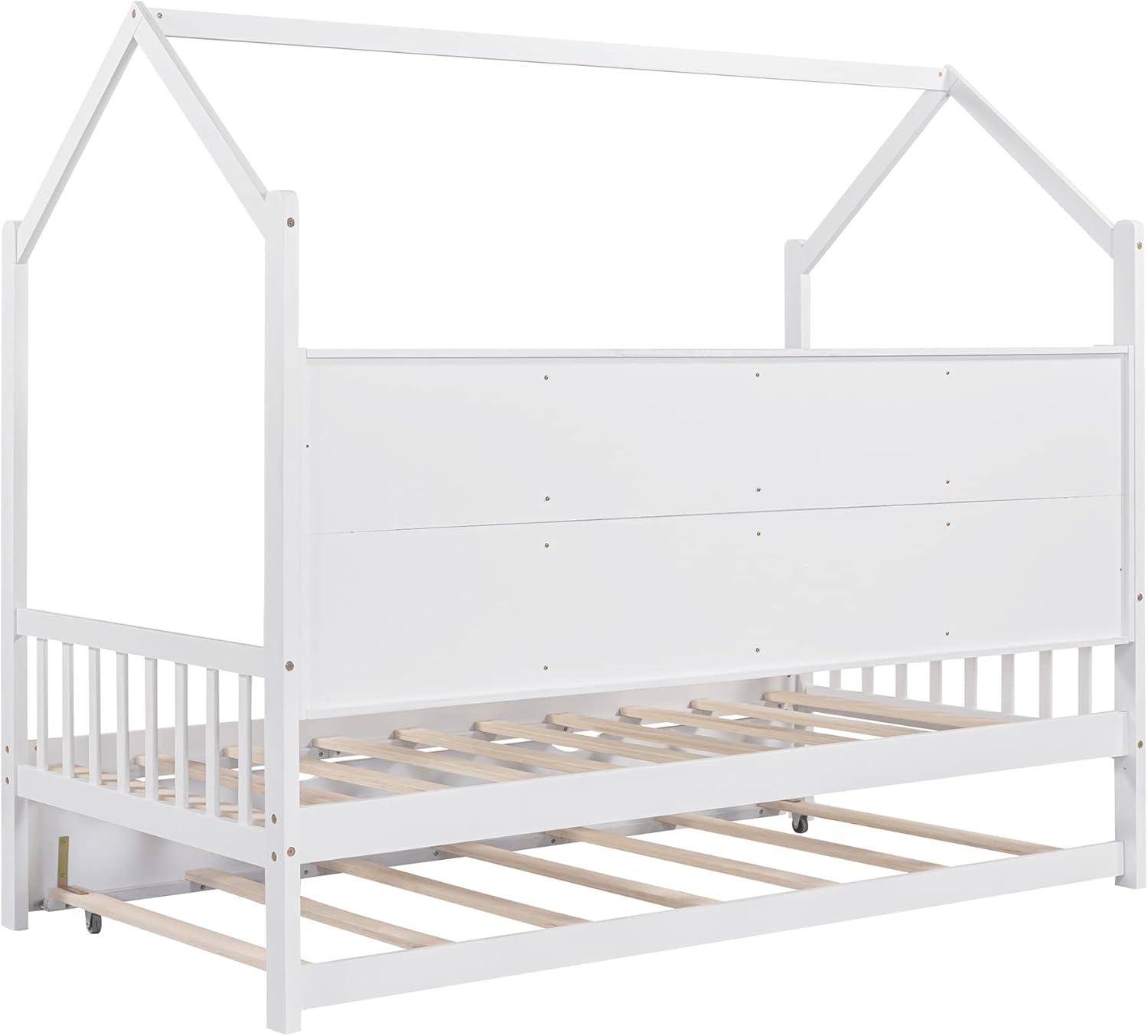 Merax Twin Size Platform Bed with Trundle, Wooden Twin Size House Bed Frame with Storage Shelf, No Box Springs Needed, White