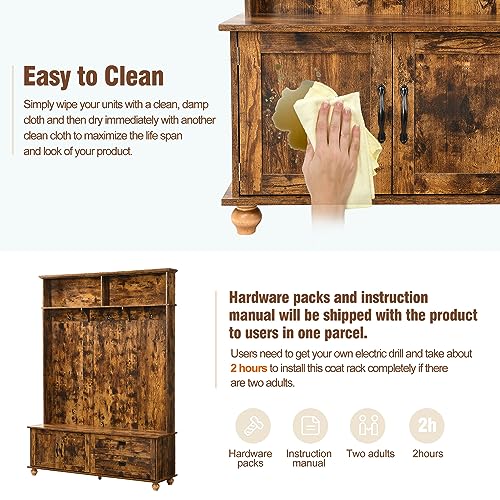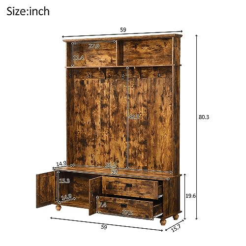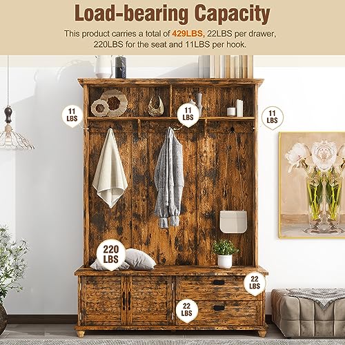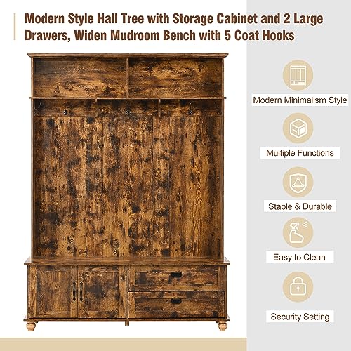 Wide Hall Tree with Storage Bench Coat Rack with Cabinet and 2 Drawers Wooden, High Back Mudroom Bench with 5 Hooks for Mudrooms Organization Entryway Living Room, White