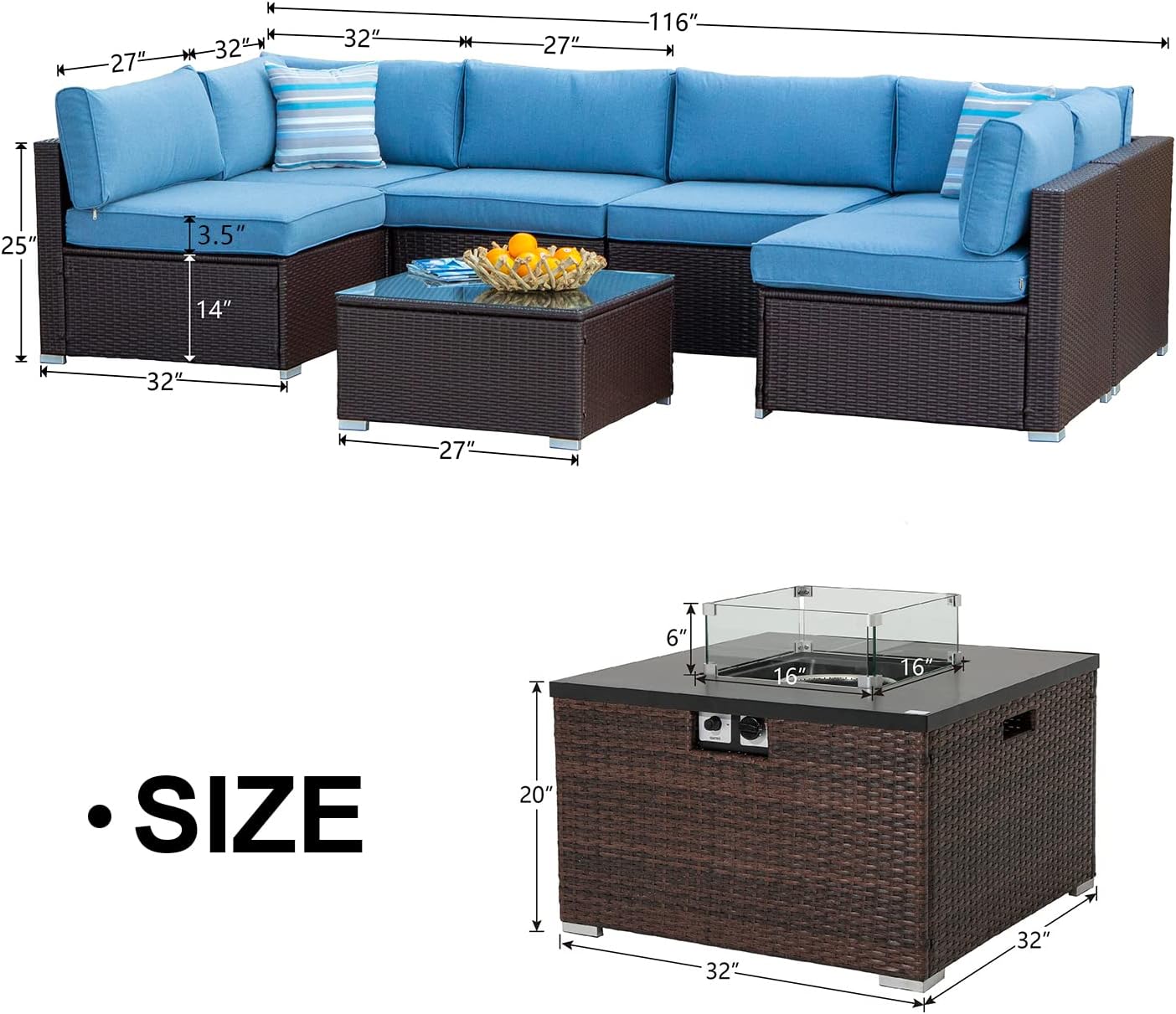 COSIEST 8 Piece Propane Fire Pit Table Outdoor Sectional Sofa, Chocolate Brown Patio Furniture Set w 32-inch Square Wicker Fire Table (40,000 BTU), Glass Wind Guard for Garden, Pool, Backyard