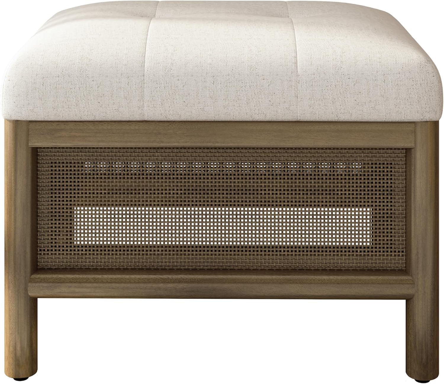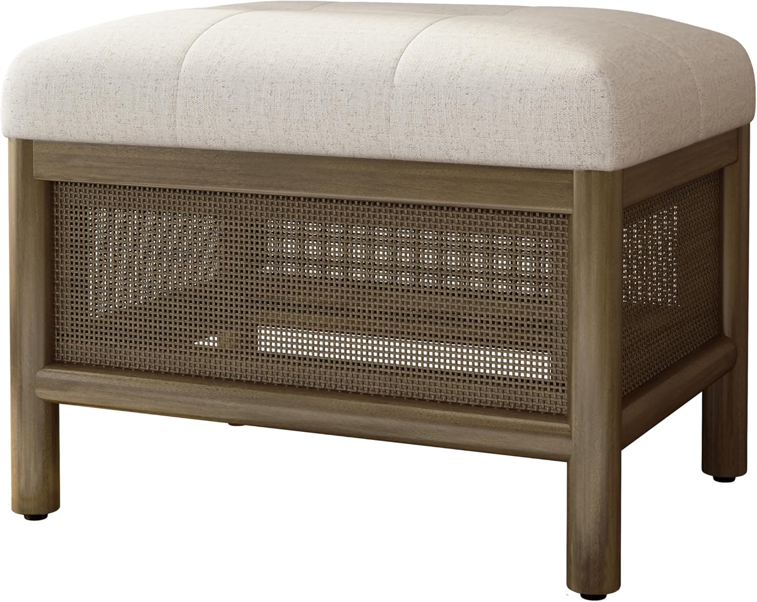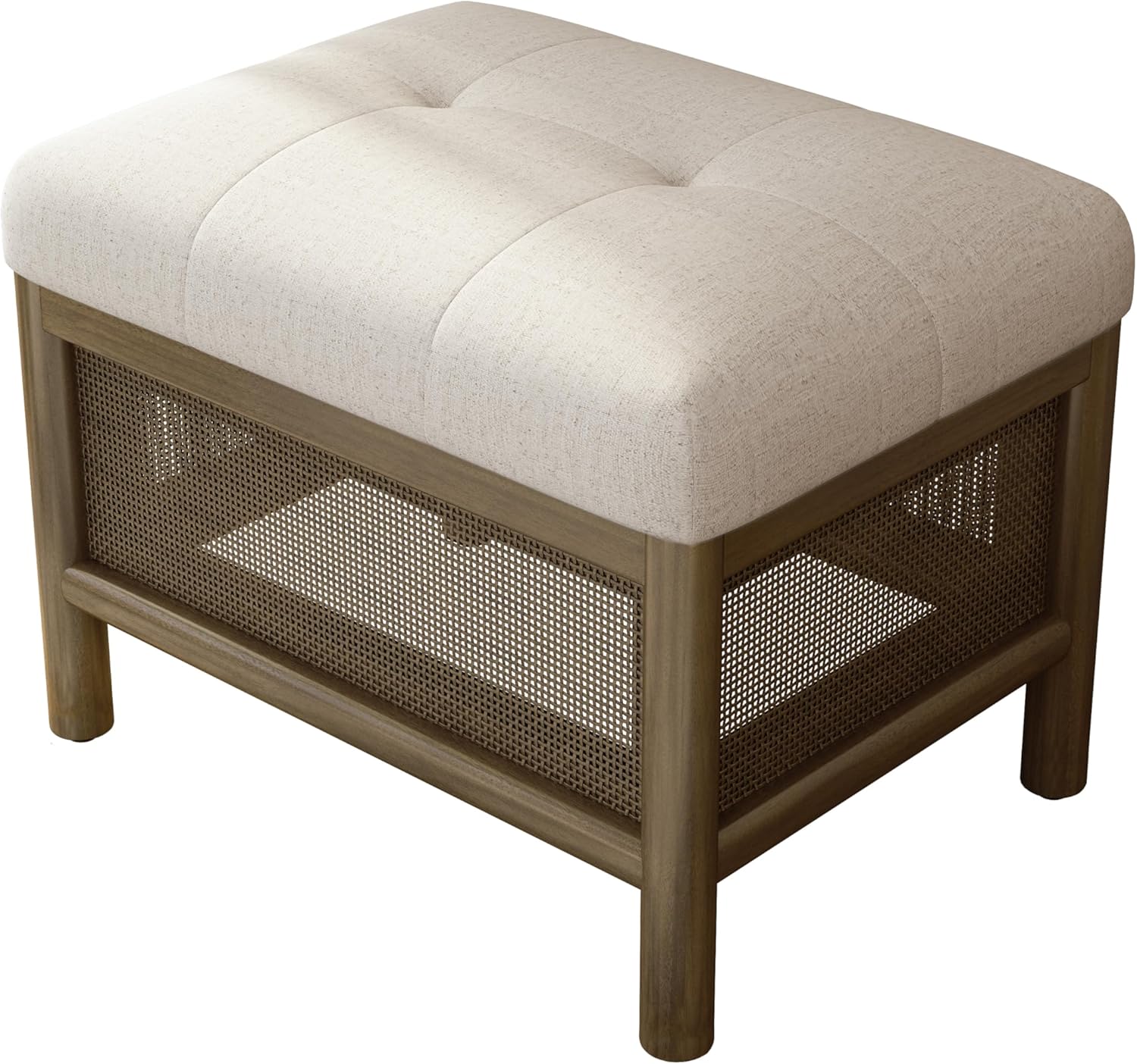 Foot Stool Ottoman with Cane Base,Cream Linen Upholstered Bench,Rectangular Solid Wood Frame Ottomans W/Breathable Fabric,Extra Seat for Bedroom,Living Room,Hallway,Entryway,Walnut,21.5"
