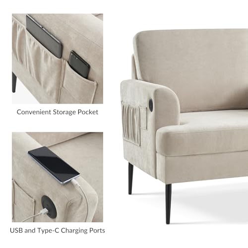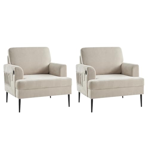 HULALA HOME Modern Oversized Accent Chairs Set of 2 with Storage Pockets, Comfy Upholstered Armchairs with USB Charging Ports, Fabric Single Sofa Chairs for Living Room Bedroom, Sage