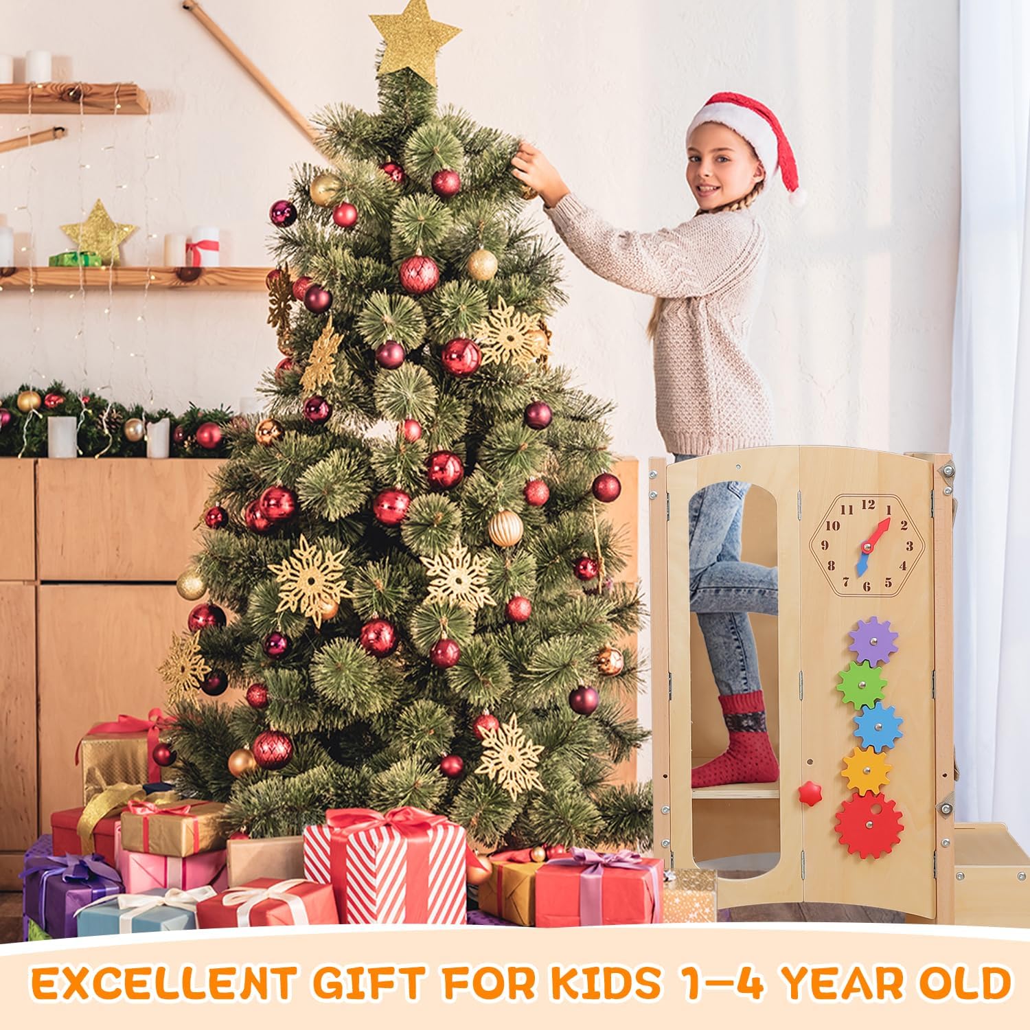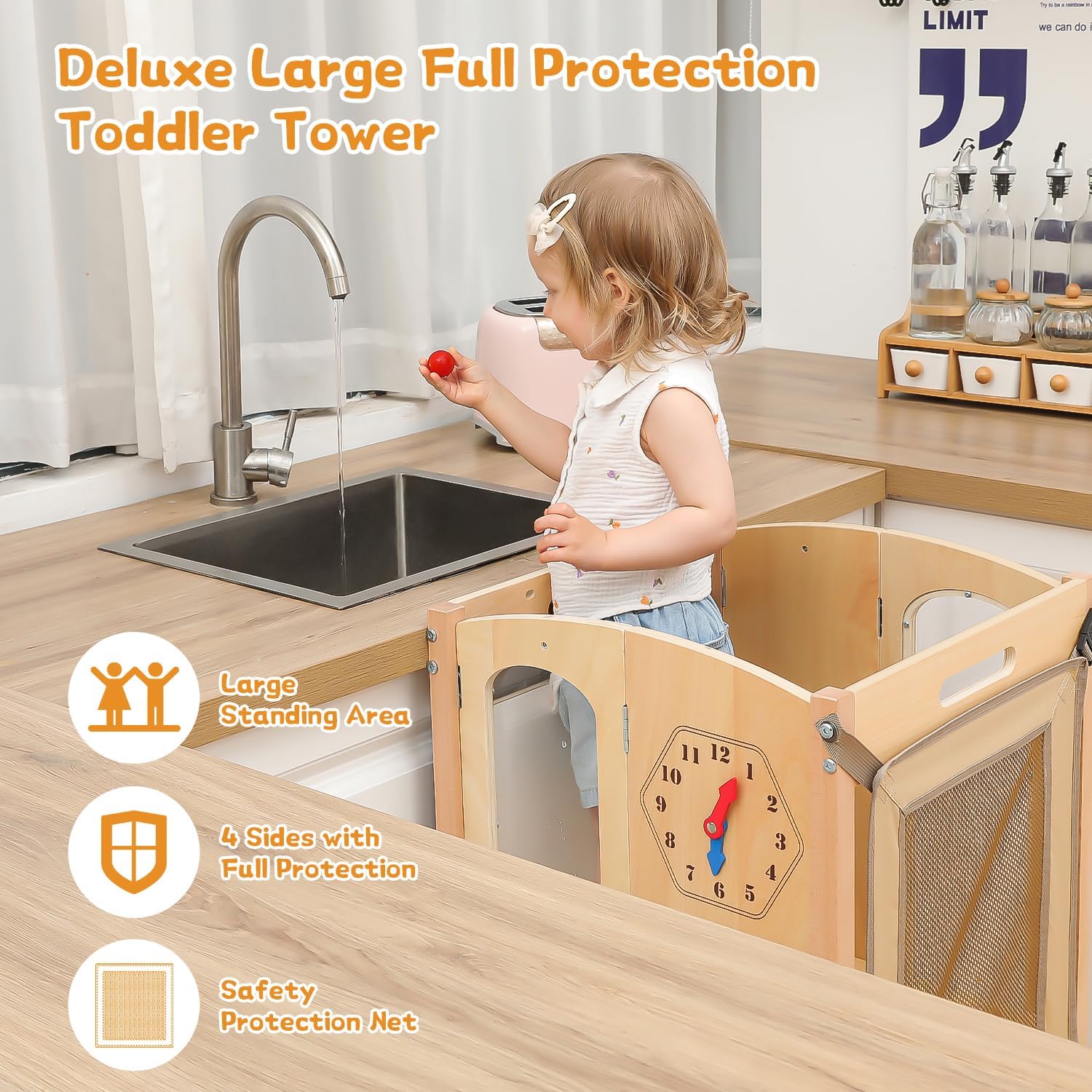 Toddler Tower, JUZBOT Foldable Toddler Kitchen Stool Helper with 2 Step Stool, Wooden Toddler Stool with Safety Net, Adjustable Height, Chalk-Whiteboard& Montessori Activity Games