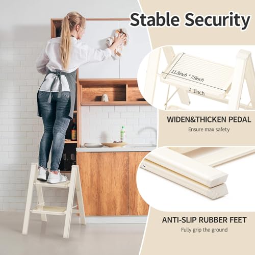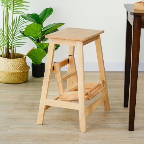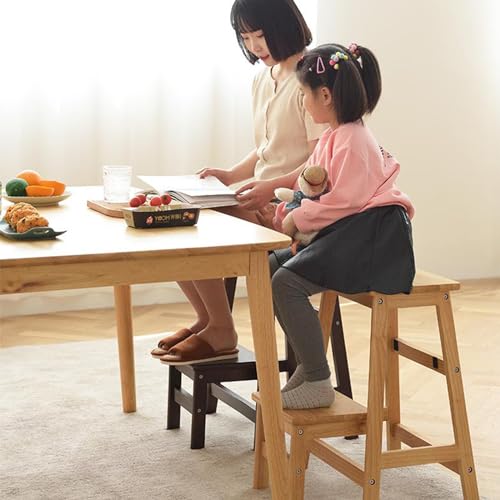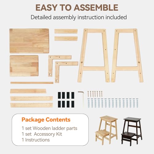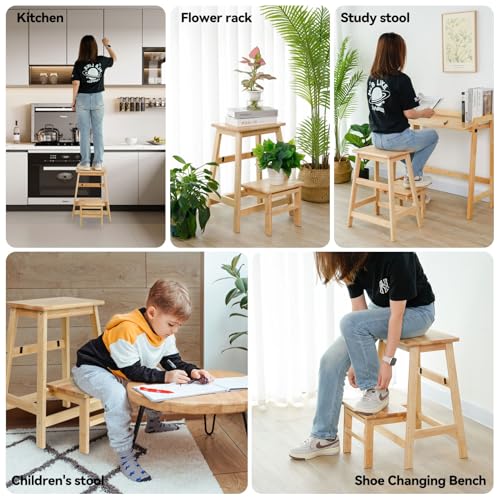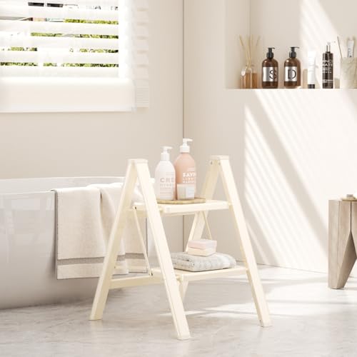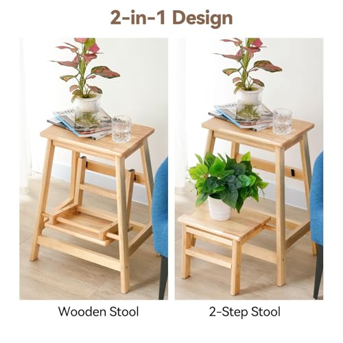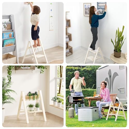 Step Stool, Solid Wood 2-Tier Step Ladder, Folding Toddler Step Stool Kitchen Helper, 2-in-1 Display Ladder and Storage Shelf, Wooden Step Stools for Adults & Kids, Natural