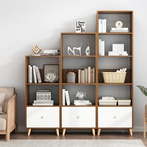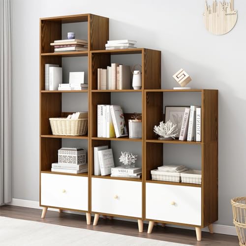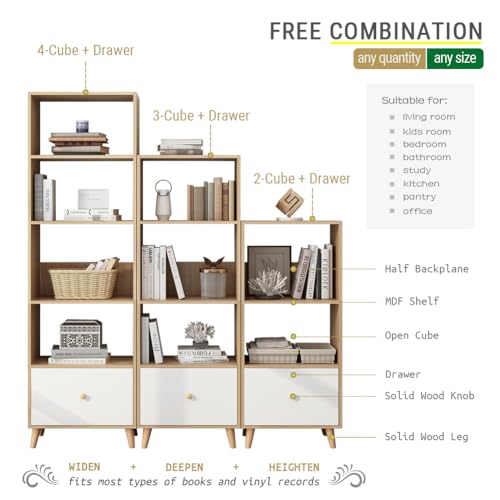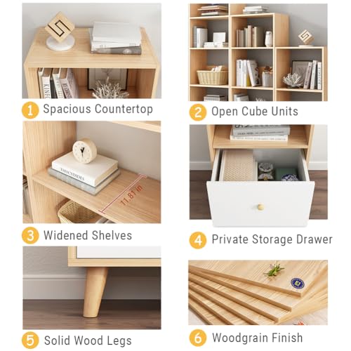 IOTXY Open Shelf Cube Bookcase - 71" Tall Mid-century Large Bookshelf with Drawer and Deepen Display Storage Cabinet for Home Office, Oak