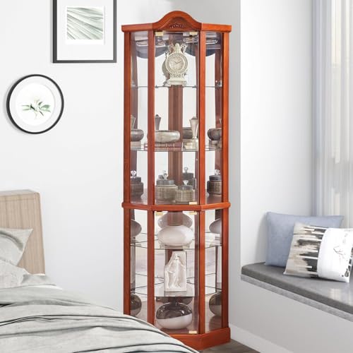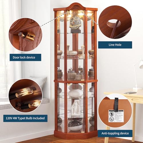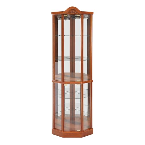 Lighted Wooden Corner Display Curio Cabinet, Two Section Shelving Unit with Tempered Glass Door, Bar and Liquor Storage Area with 6 Shelves - Lorona, Oak