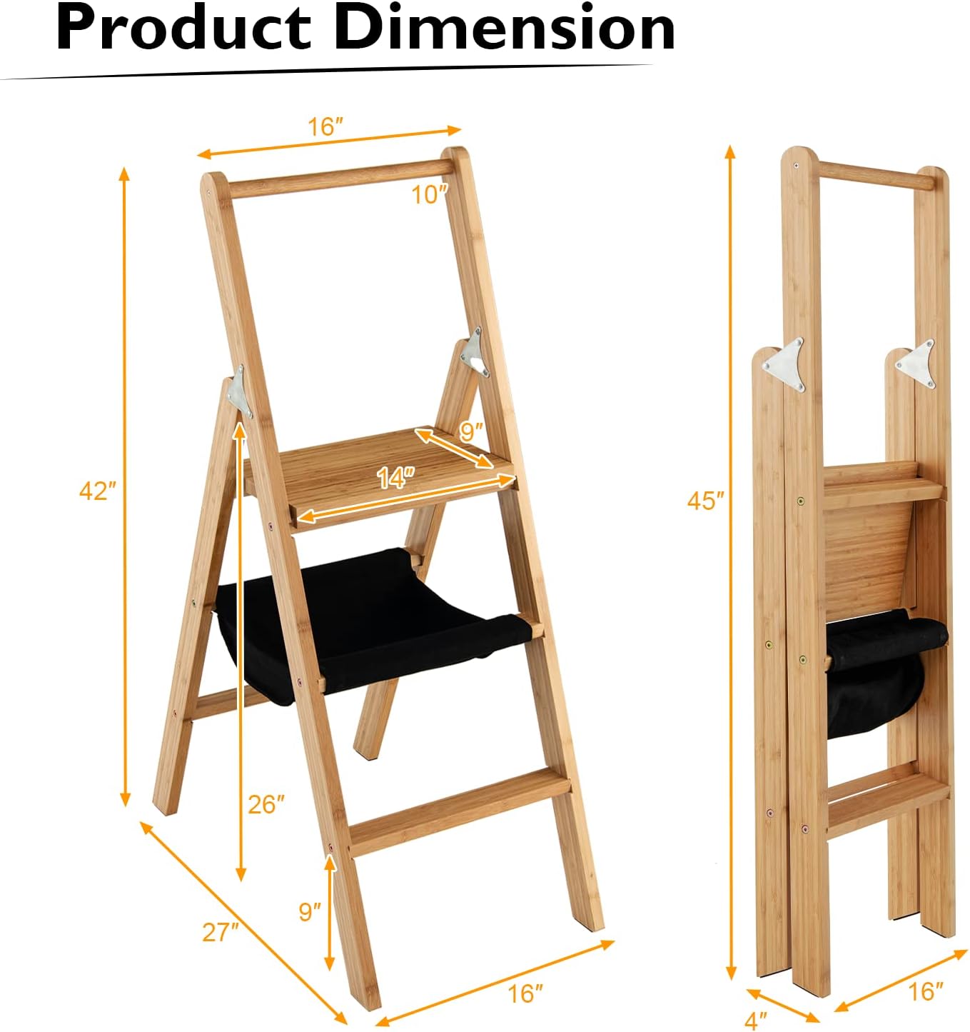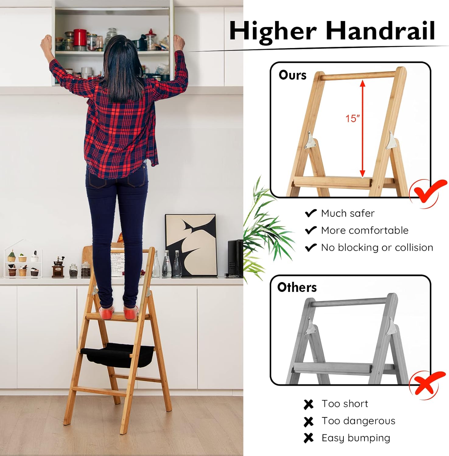 Giantex 3 Step Ladder, 100% Bamboo Folding Step Stool with Handrail, Storage Bag, Wide Pedal, Max Load 330lbs, Lightweight Portable Stepping Stool for Adults