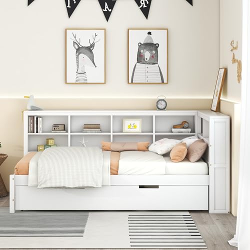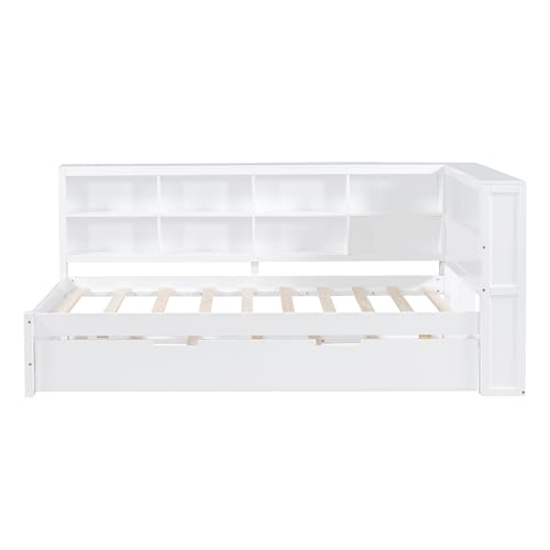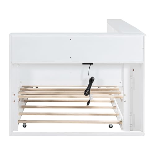 Harper & Bright Designs Twin Daybed Frame with L-Shaped Bookcases, Wood Bed Frames with Trundle and USB Ports,Twin Size Platform Bed with Storage Shelf and Charging Station for Kids Girls Boys, White