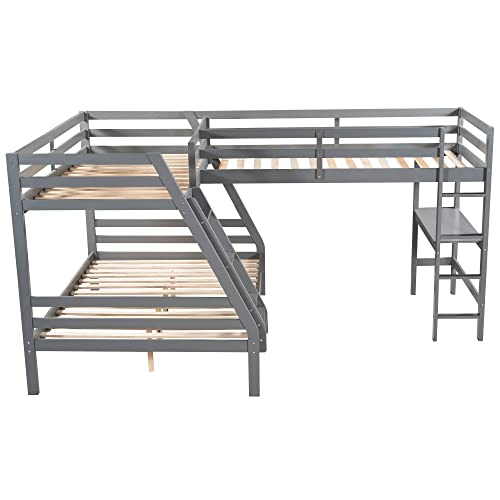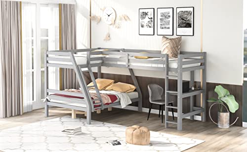 RUNNA Full and Twin Size L-Shaped Bunk Bed with Slide, Short Ladder and Full Length Guardrail, L-Shaped Full Size bunk bed with a Twin Size Bunk Bed, L-Shaped Low Bunk Bed for 4 Kids (White+4 Bed)