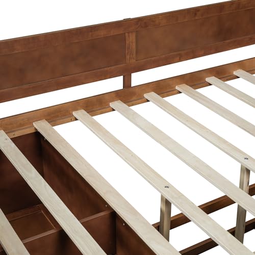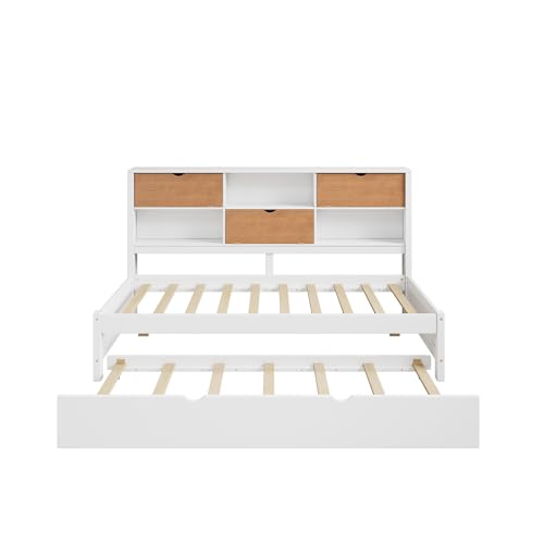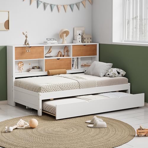 Twin Size Daybed Frame, L-Shaped Bed with Trundle and Bookcase, Corner Bed Wooden Captain Bed with Led Downlight and USB Port for Small Room Bedroom Guest Room, No Box Spring Needed, Walnut and White