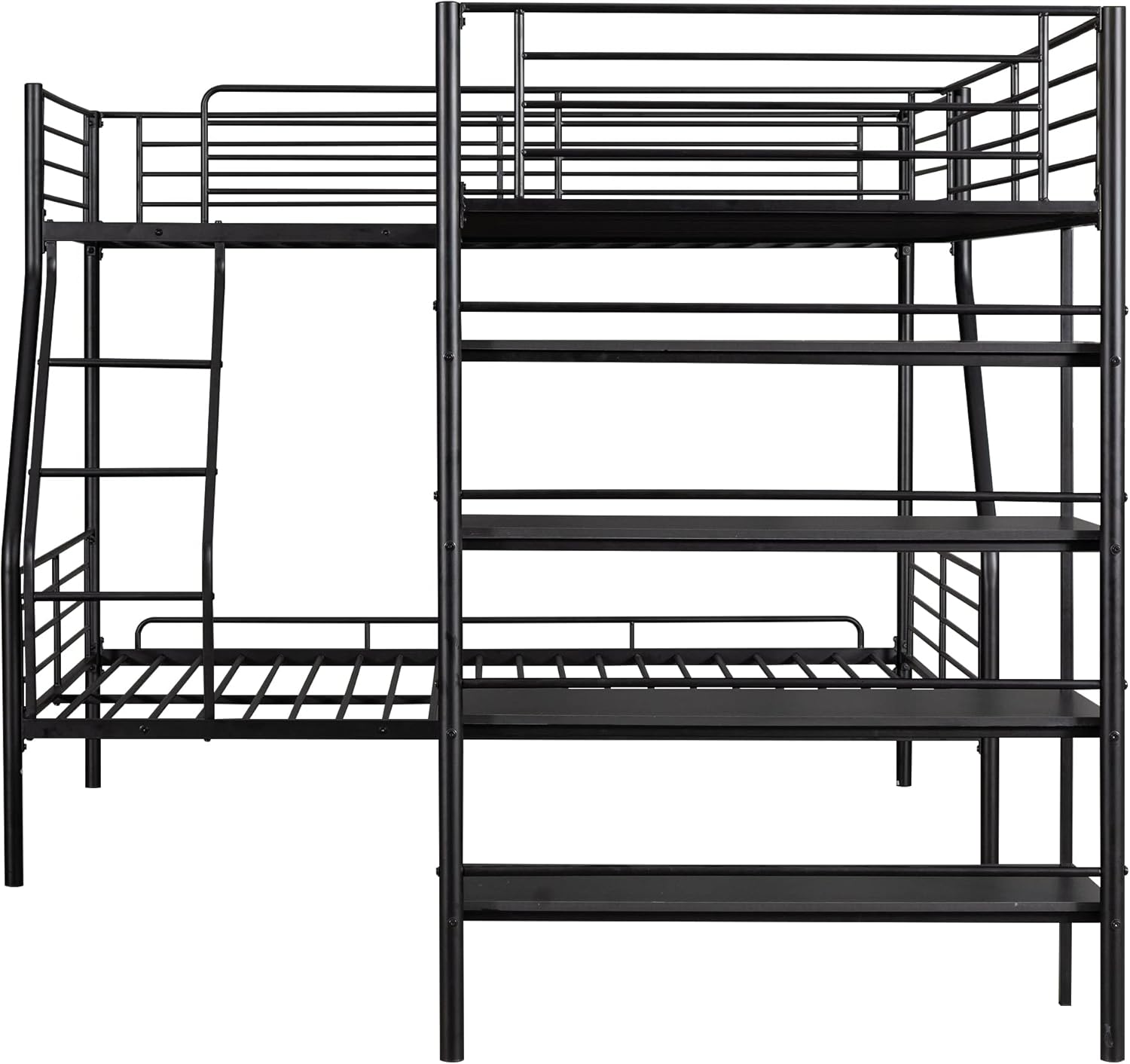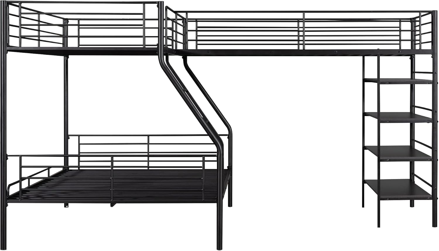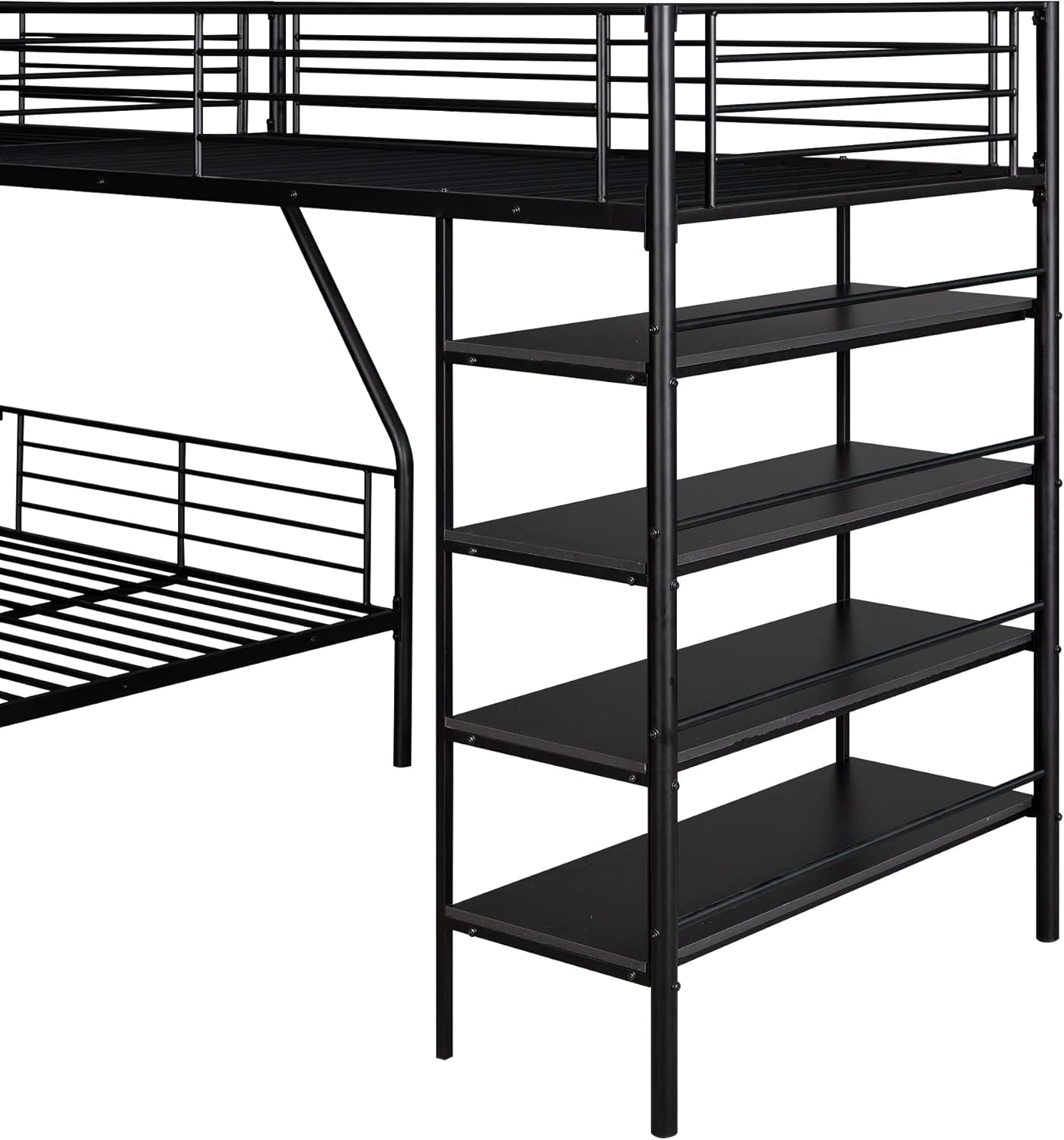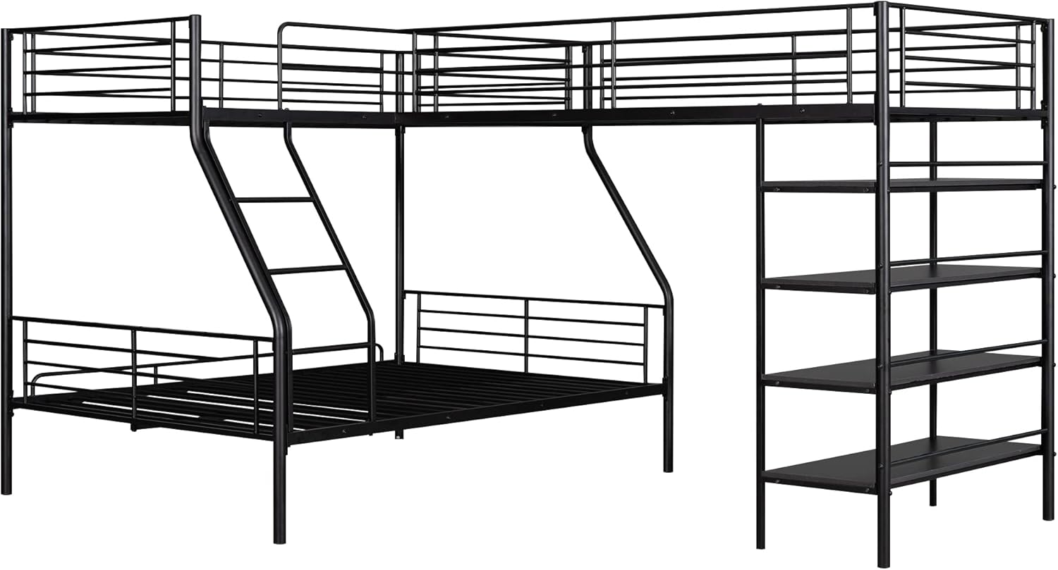 Metal L-Shaped Bunk Bed,Triple Bunk Beds for Kids,L-Shaped Metal Twin Over Full Bunk Bed and Twin Size Loft Bed with Four Built-in Shelves,for Three Kids Teens Boys Girls,Black