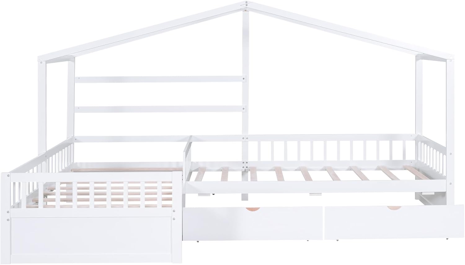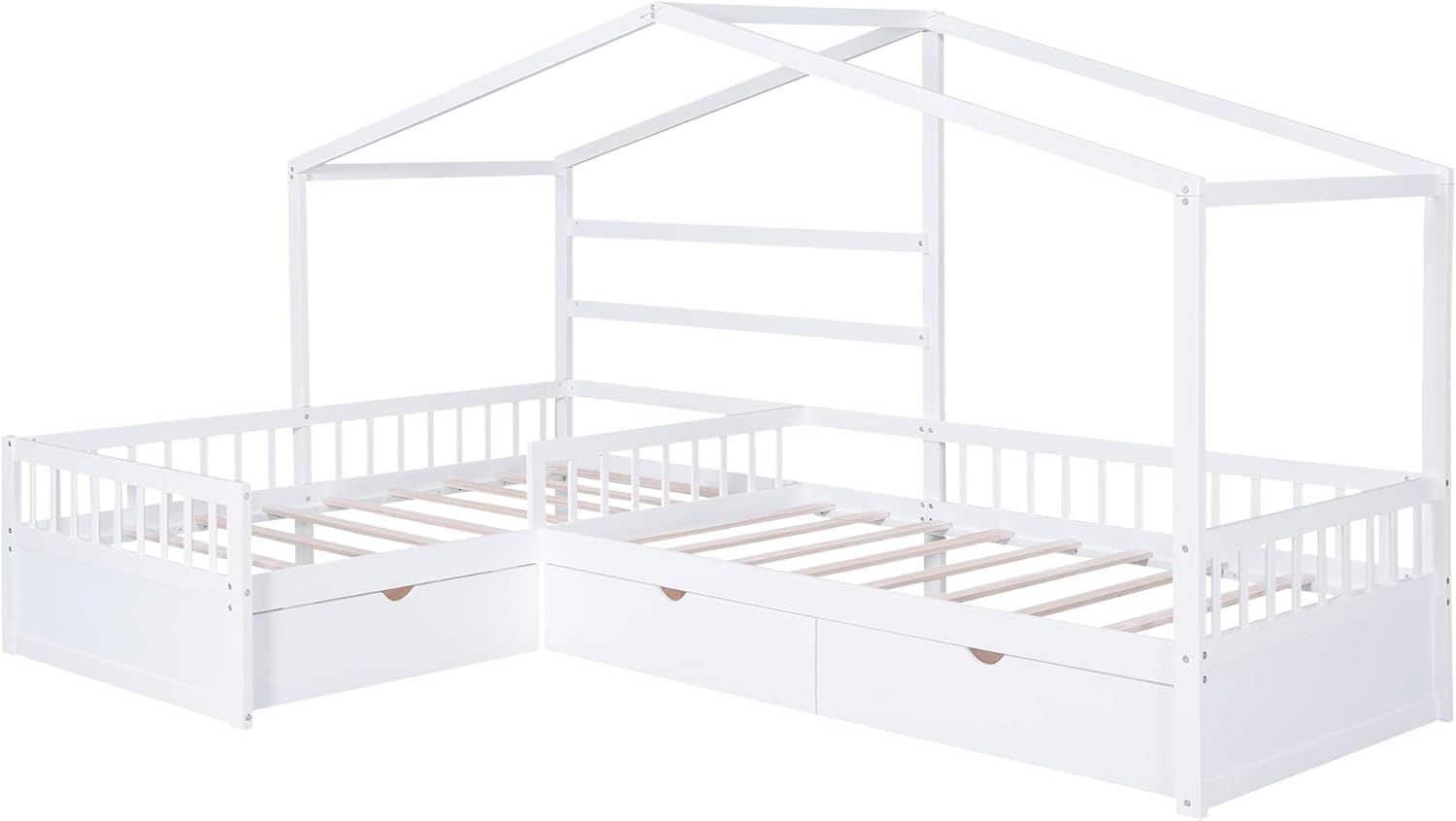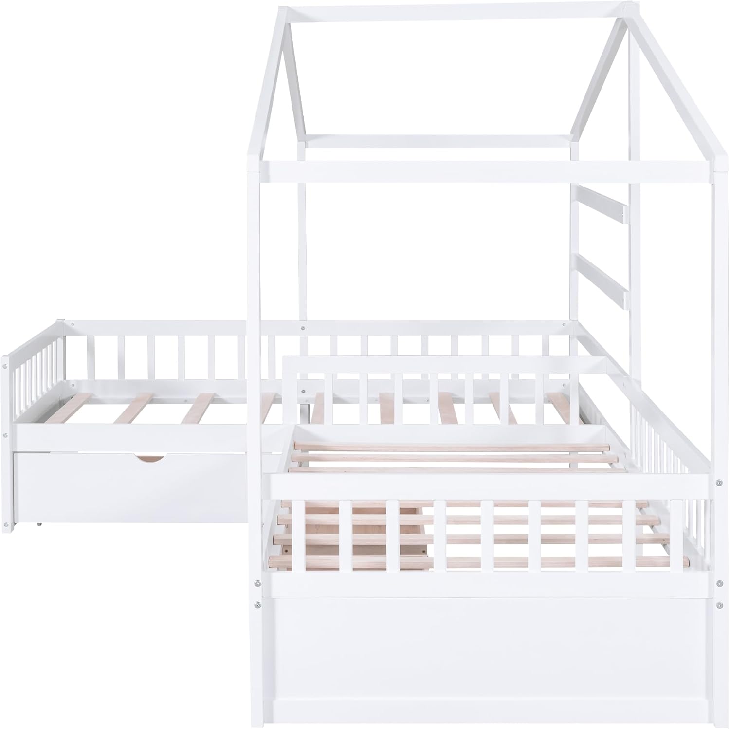 L-Shaped House Platform Bed with 3 Storage Drawers,Wooden Twin Size Platform Bed Frame with Sturdy Slat Support, 2 in 1 Platform Bed for Kids Teens Boys Girls Bedroom,White