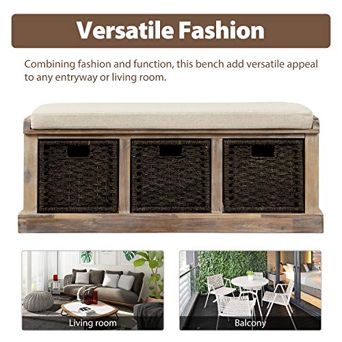 Knocbel Home Collection Wicker Storage Bench, Wood Entry Hallway Bedroom Bench Cabinet with Cushion, 3-Drawer and 3 Woven Baskets, Fully Assembled, 20.2" H x 44" L x 13.7" W (Grey)