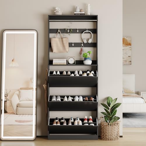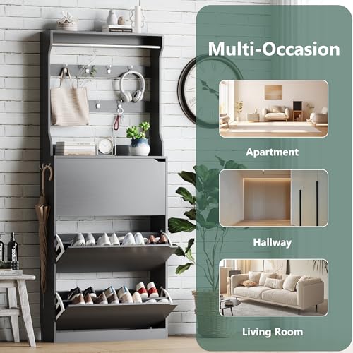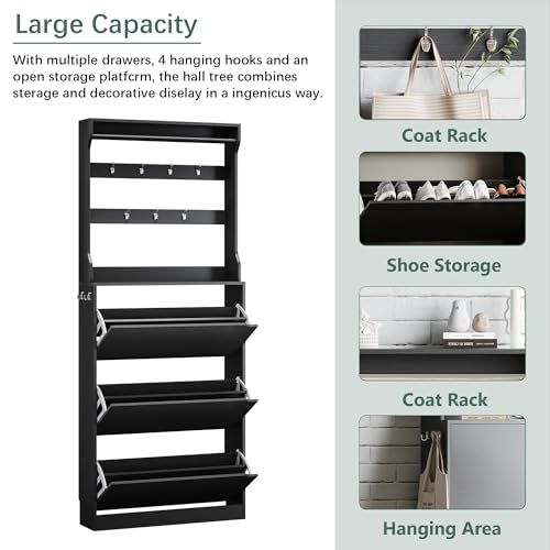 Shoe Storage Cabinet for Entryway,Black Shoe Cabinet with Coat Rack for Entryway Furniture Freestanding Hidden Shoe Storage with 3 Flip Drawer Narrow Shoe Rack Storage Organizer for Entryway