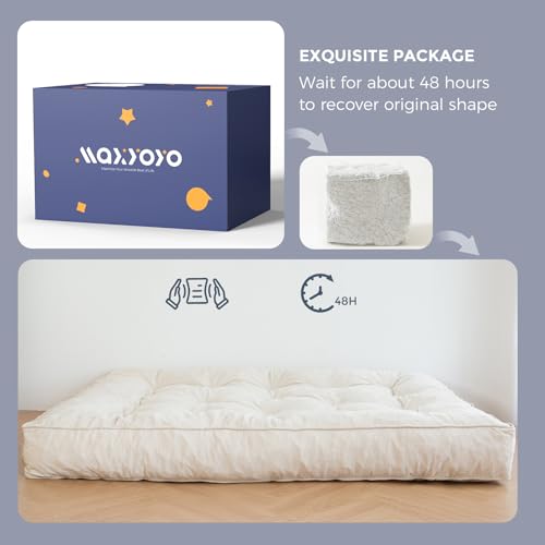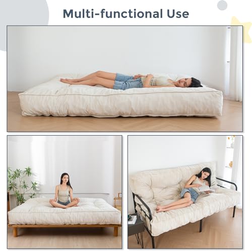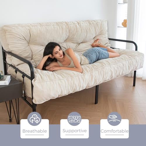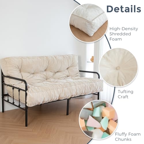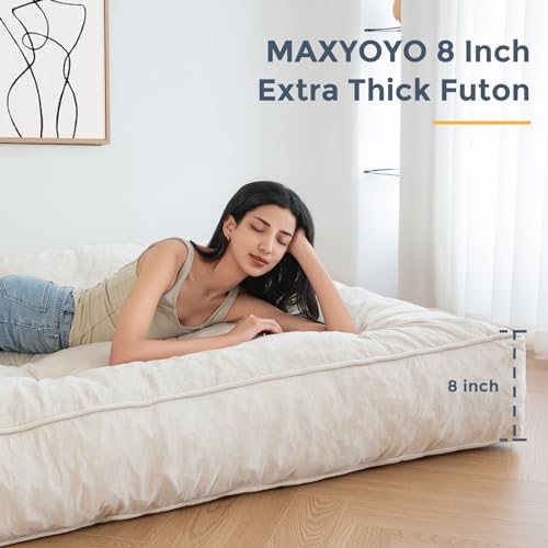 MAXYOYO 8" Futon Mattress Full Size, Extra Thick Futons Sofa Couch Bed, Velvet Floor Mattress for Adults, Shredded Foam Filling (Frame Not Included), Beige