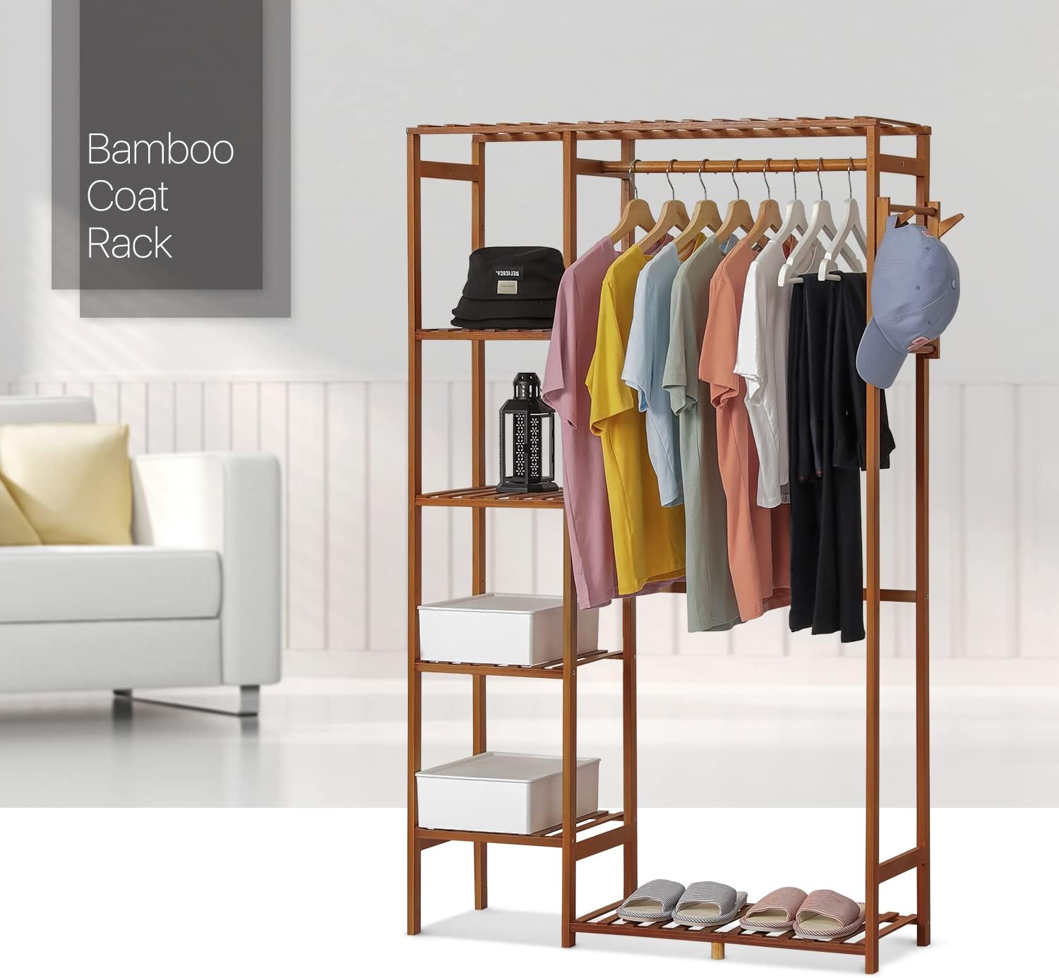 MoNiBloom Bamboo Garment Rack with Shelves 6 Tier Closet Coat Storage Organizer Clothes Hanging Rack with Pants Rack & Hooks for Bedroom, Living room, Office, Mudroom, Brown