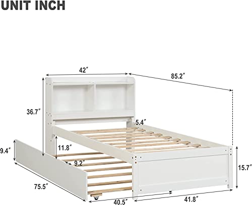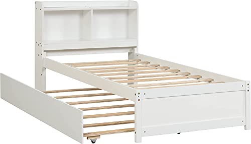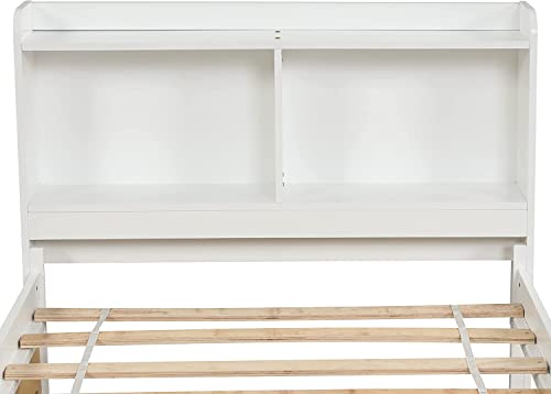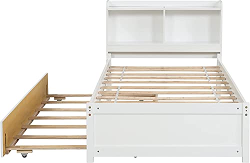 Harper & Bright Designs Full Bed with Trundle, Full Trundle Bed with Bookcase Headboard, Wood Full Size Platform Bed with Twin Trundle Bed Under for Kids Girls Boys, White