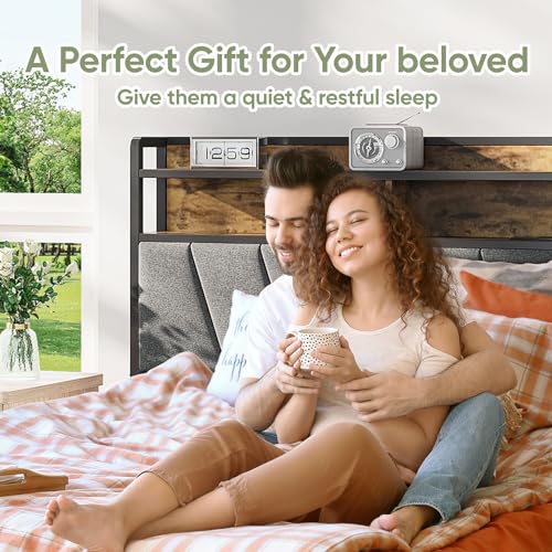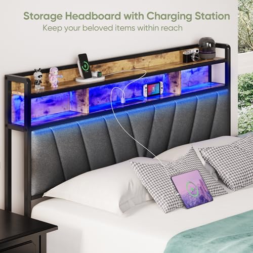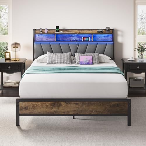 Full Bed Frames, Metal Bed Frames with Charging Station, LED Lights Bed Frames with Upholstered Storage Headboard, Sturdy and Noise-free, Storage Space under Bed, No Box Spring Needed, Brown