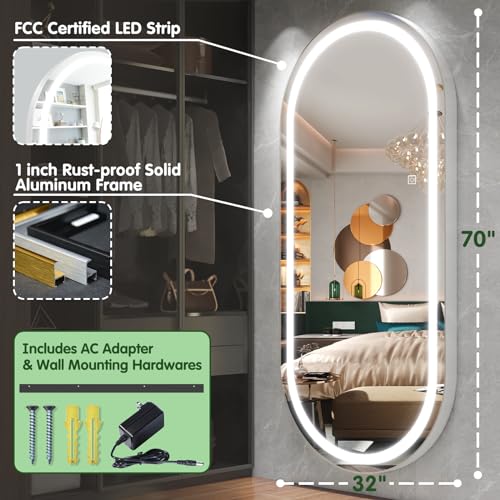FENNIO 70" x 32" Large Luxury Wall Mounted Mirror with LED Lights - Oval Full Length Mirror, LED Lighted Full Body Dressing Mirror for Bedroom, Salon, Dimmable & 3-Color Lighting