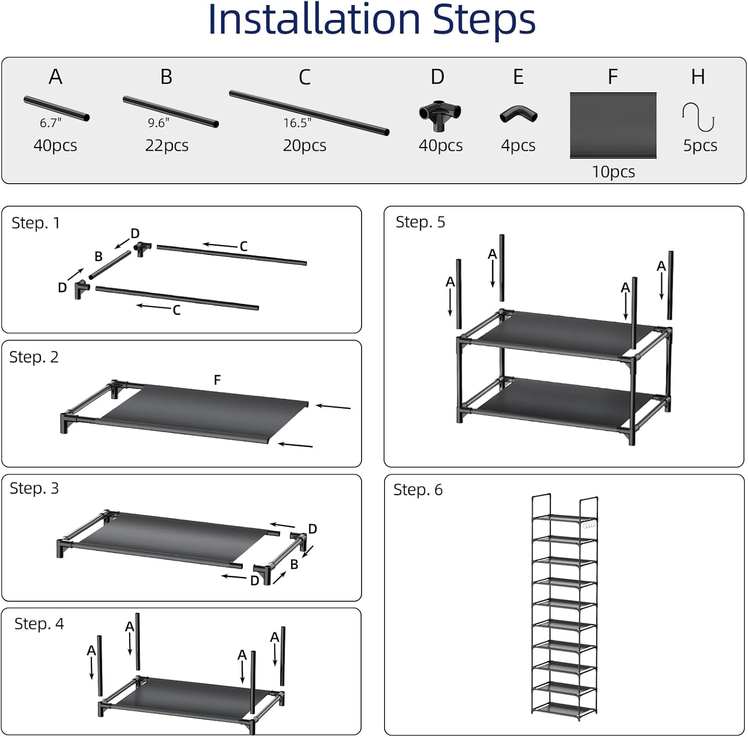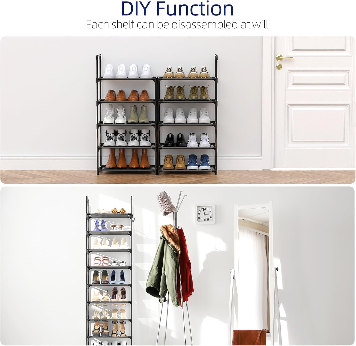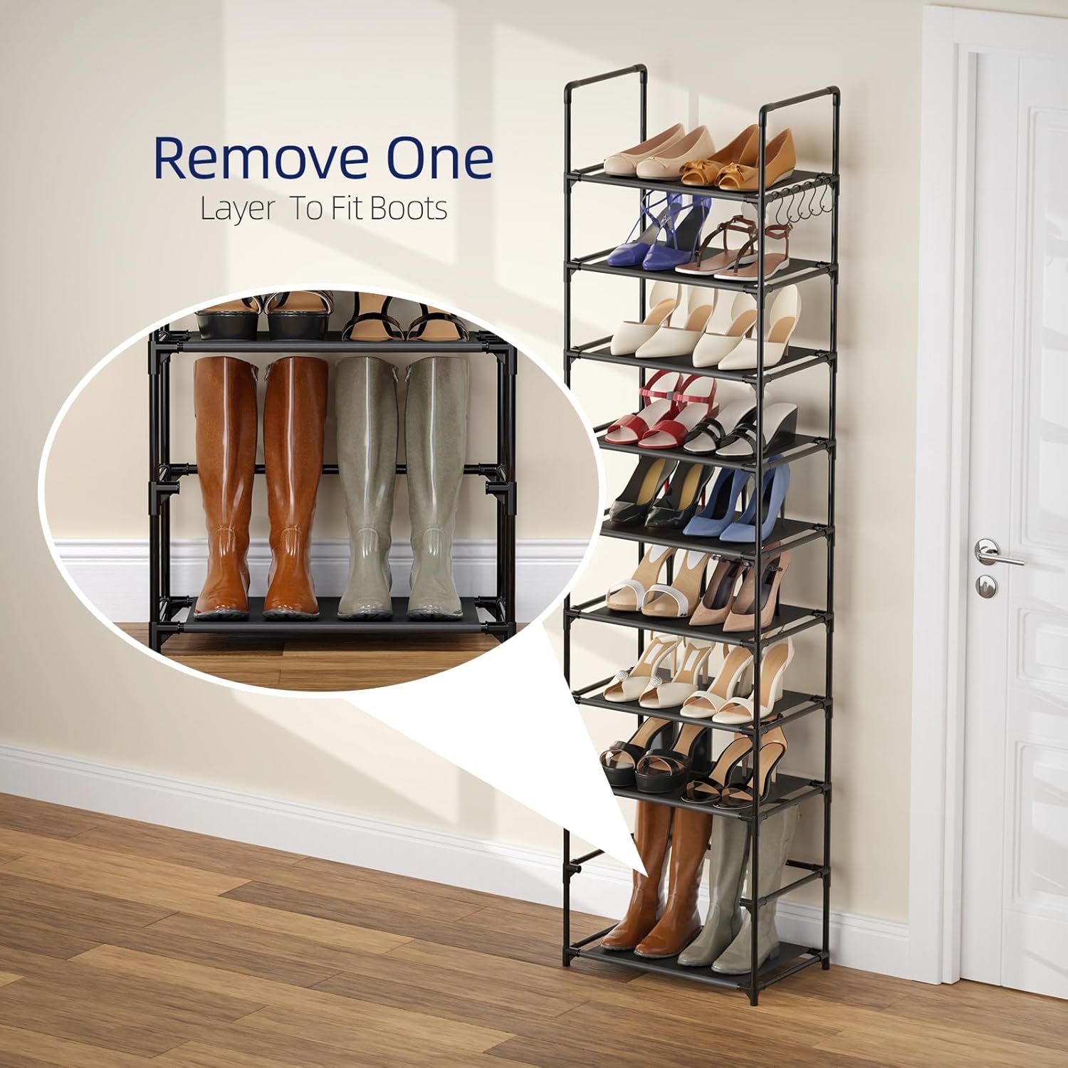 10 Tiers Tall Shoe Rack, 20-25 Pairs Boots Organizer Storage Sturdy Narrow Shoe Shelf, Black Metal Stackable Shoe Rack for Entryway, Closet with Hooks
