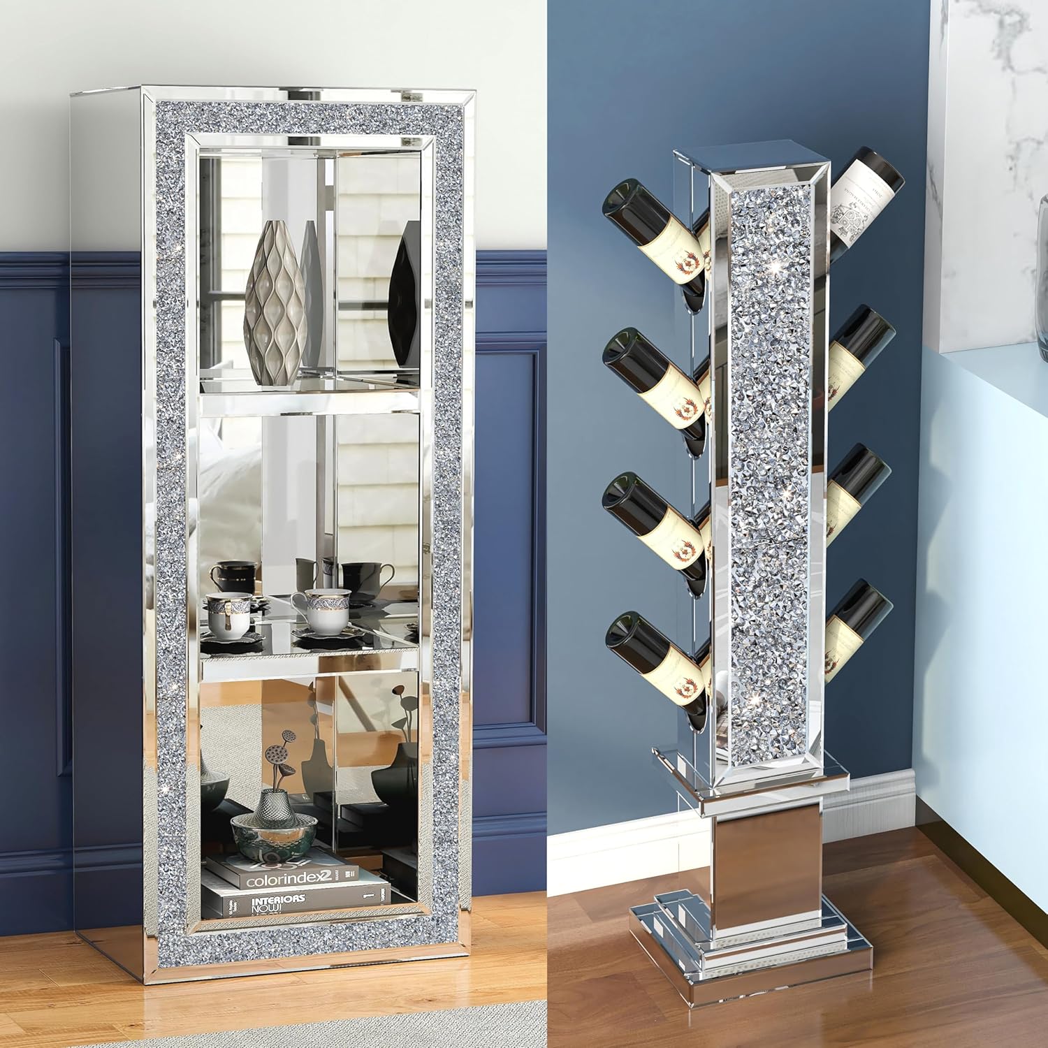 8 Bottle Freestanding Floor Mirrored Wine Bottle Rack with Crushed Diamond Glass Holder and Wine Bottle Storage Home Bar Furniture for Home Dining Room Decorative