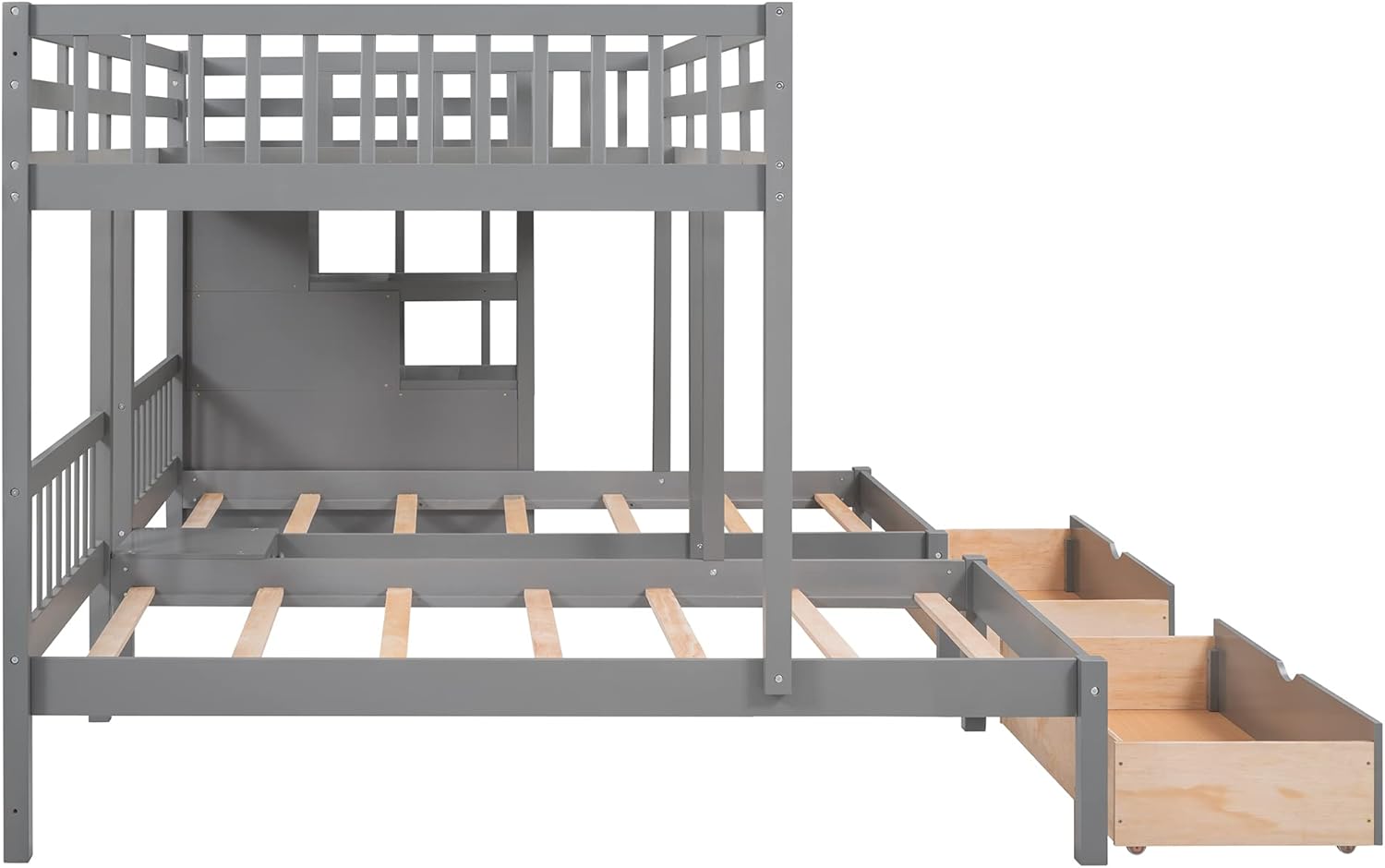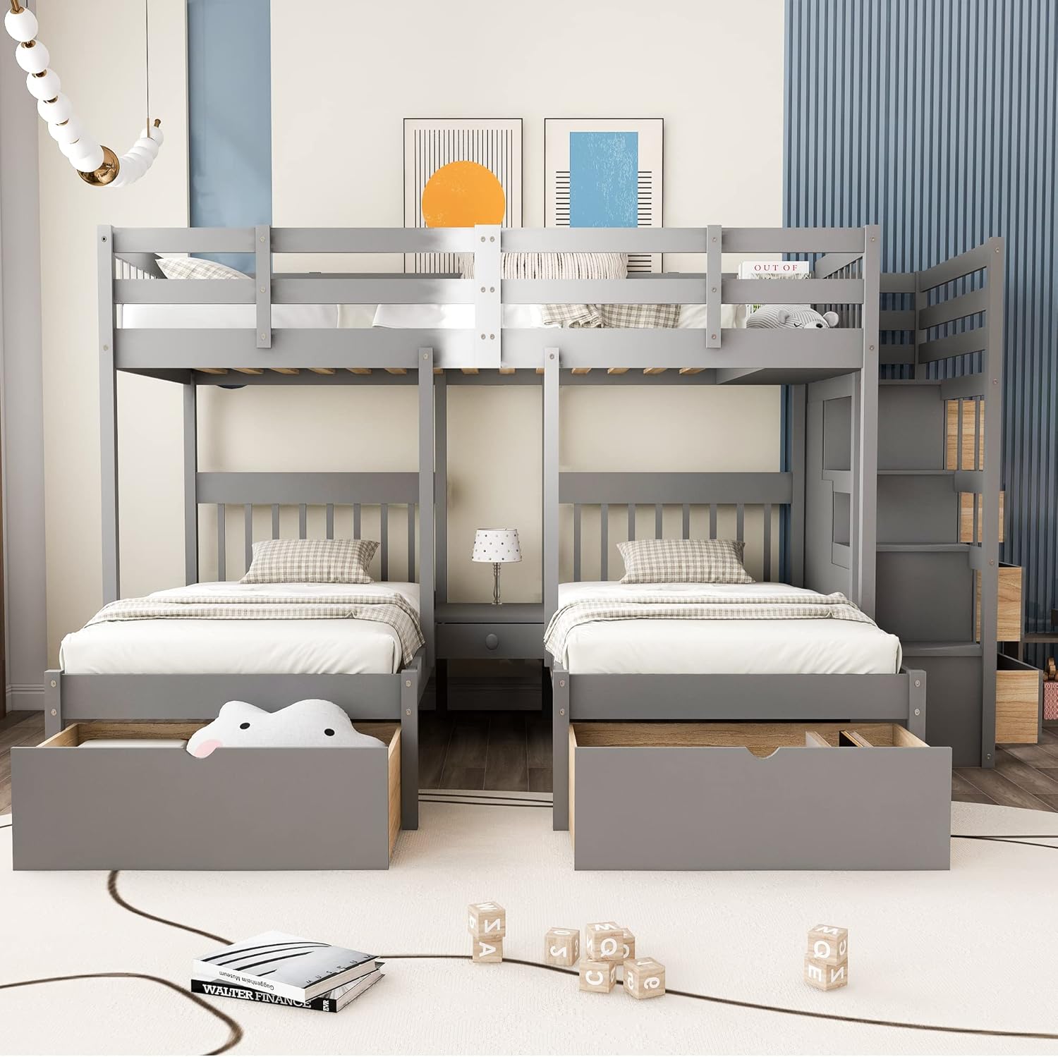 SOFTSEA Full Over Twin & Twin Triple Bunk Bed, L-Shaped Bunk Bed with Staircase and Drawers, Bunk Beds with 2 Storage Drawers for Large Family, Wood Bed Frame with Guardrails for Kids, 3 Beds in 1