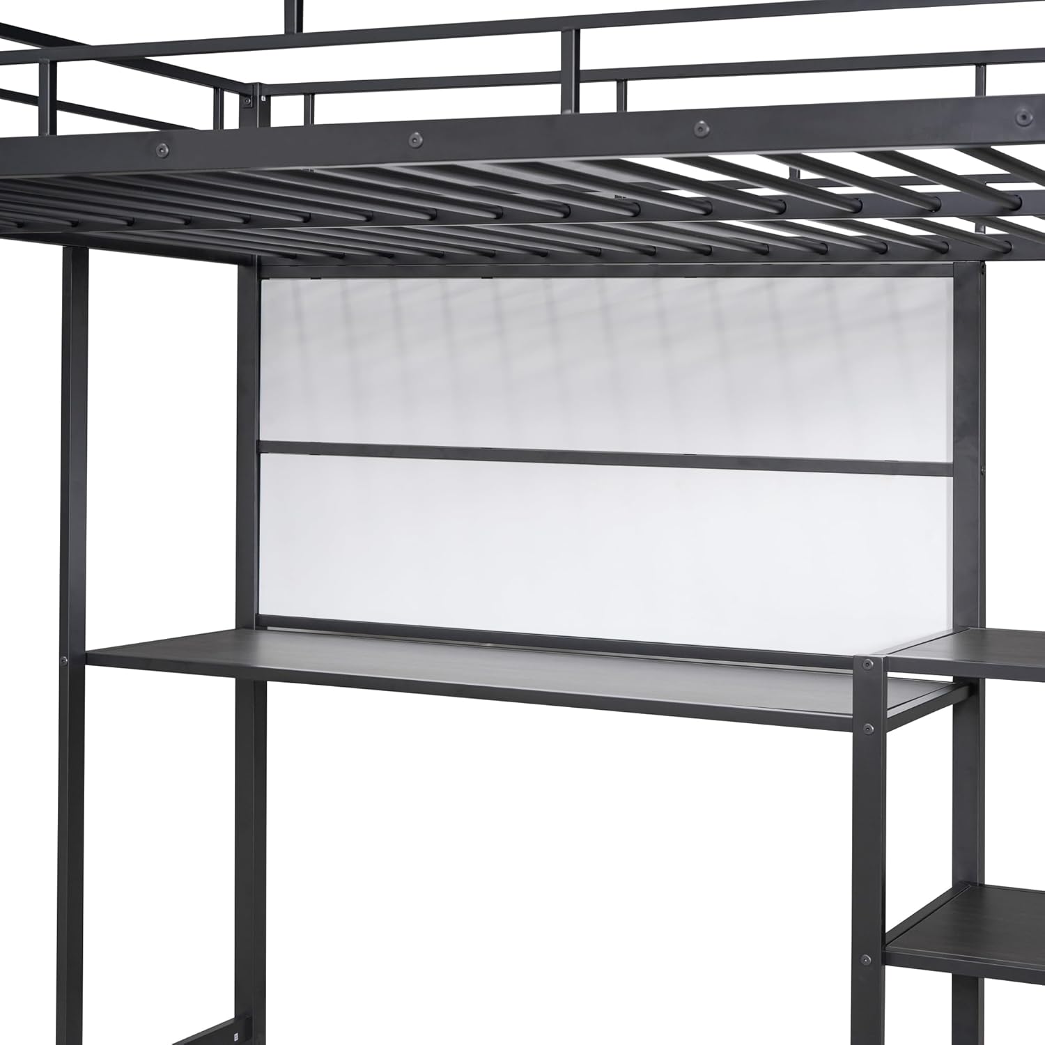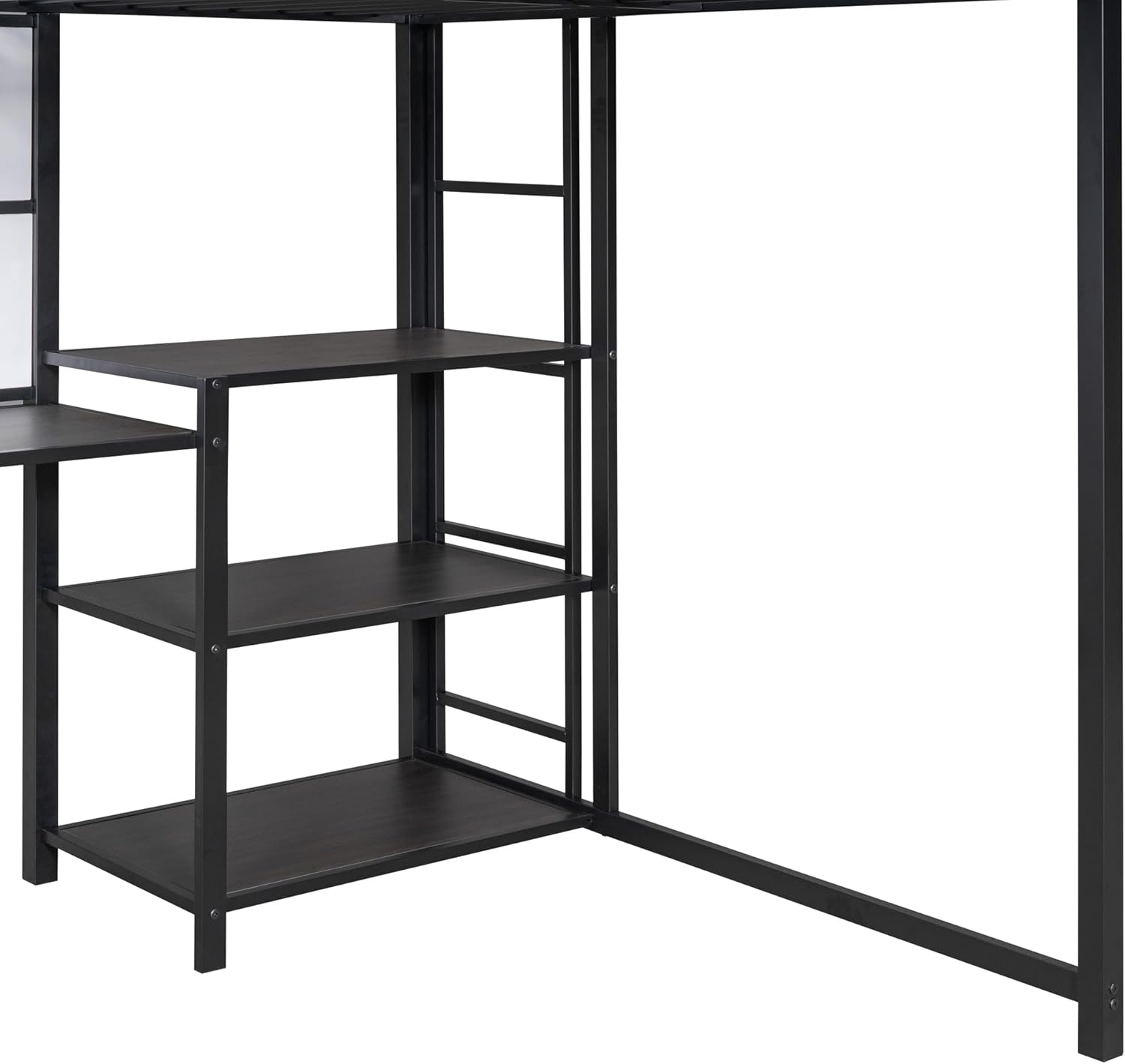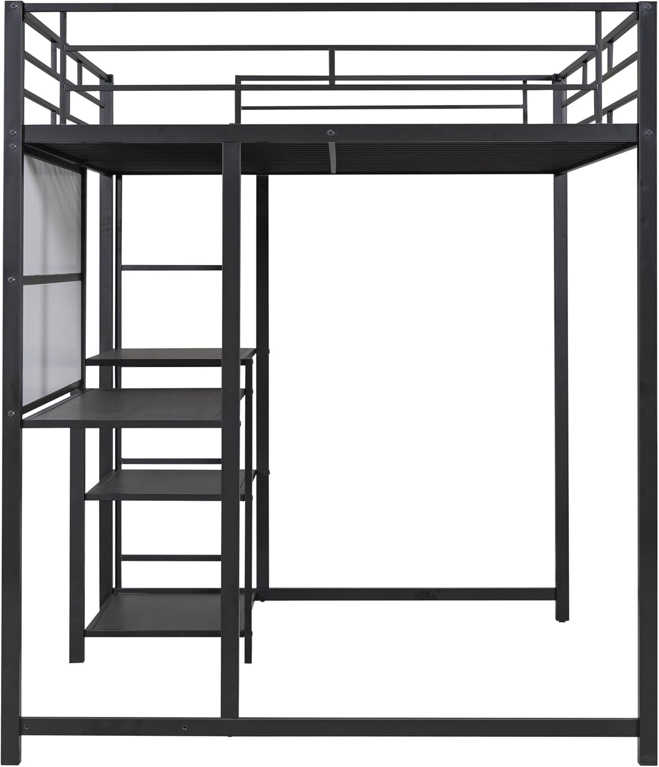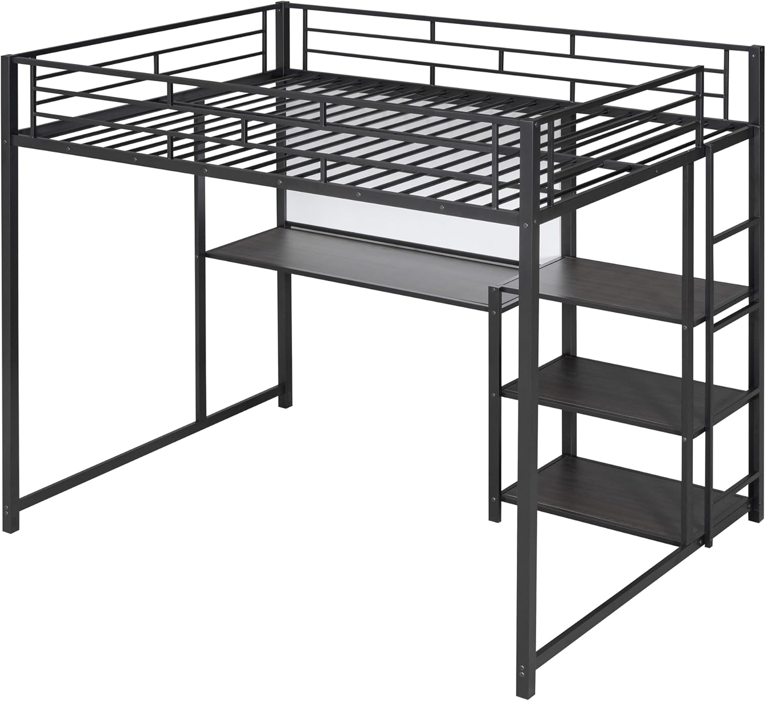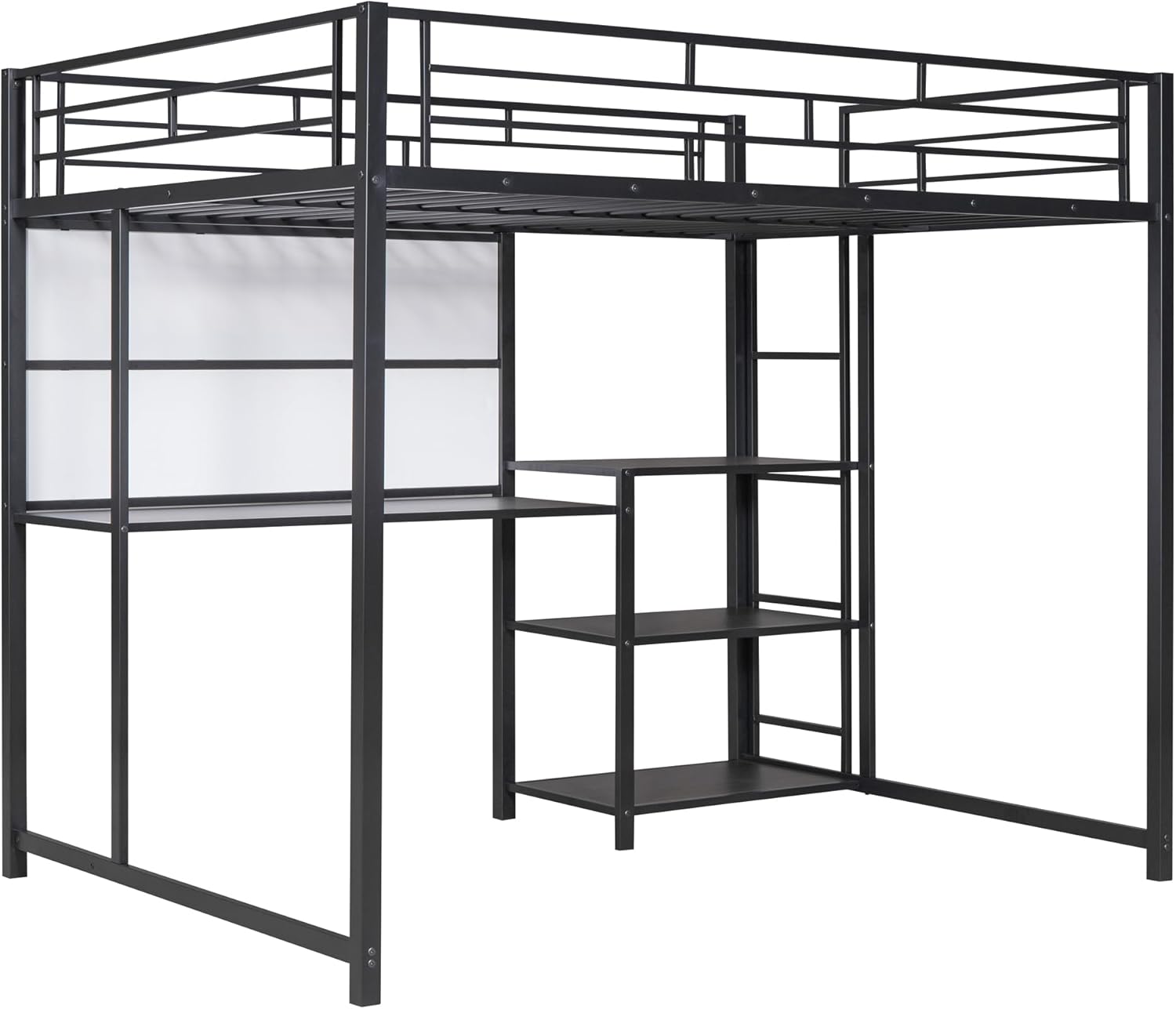 Full Size Loft Bed with Desk and Storage Shelves, Heavy Duty Metal Loft Bed with Whiteboard and 3-Tier Shelves, Full Loft Bed for Kids, Teens, Adults, Black Loft Bed Full Size