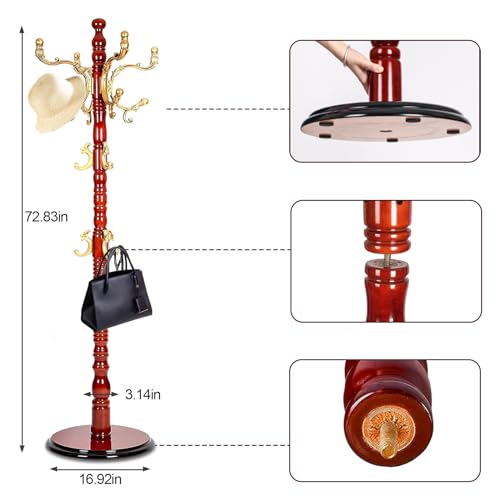 Coat Racks freestanding, High-grade Wooden Tree Coat Rack, Coat Rack Stand With 14 Hooks & Stable Disc Base, For such as coats, jackets, Home Office Hats Tree Hanger (black red)