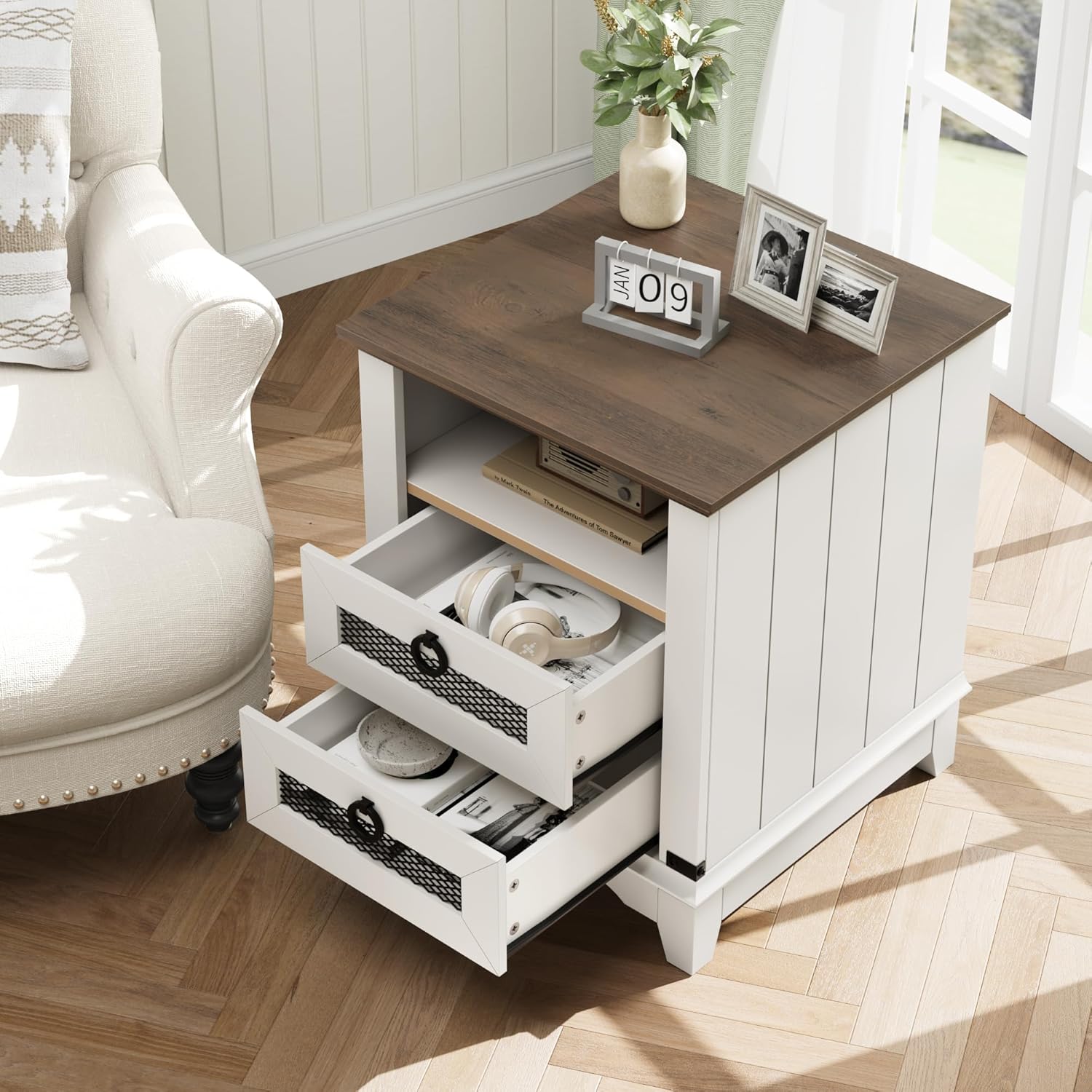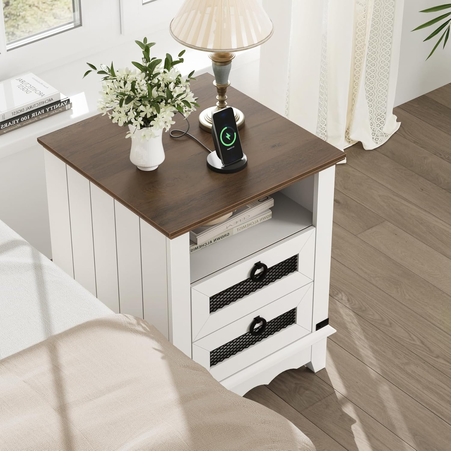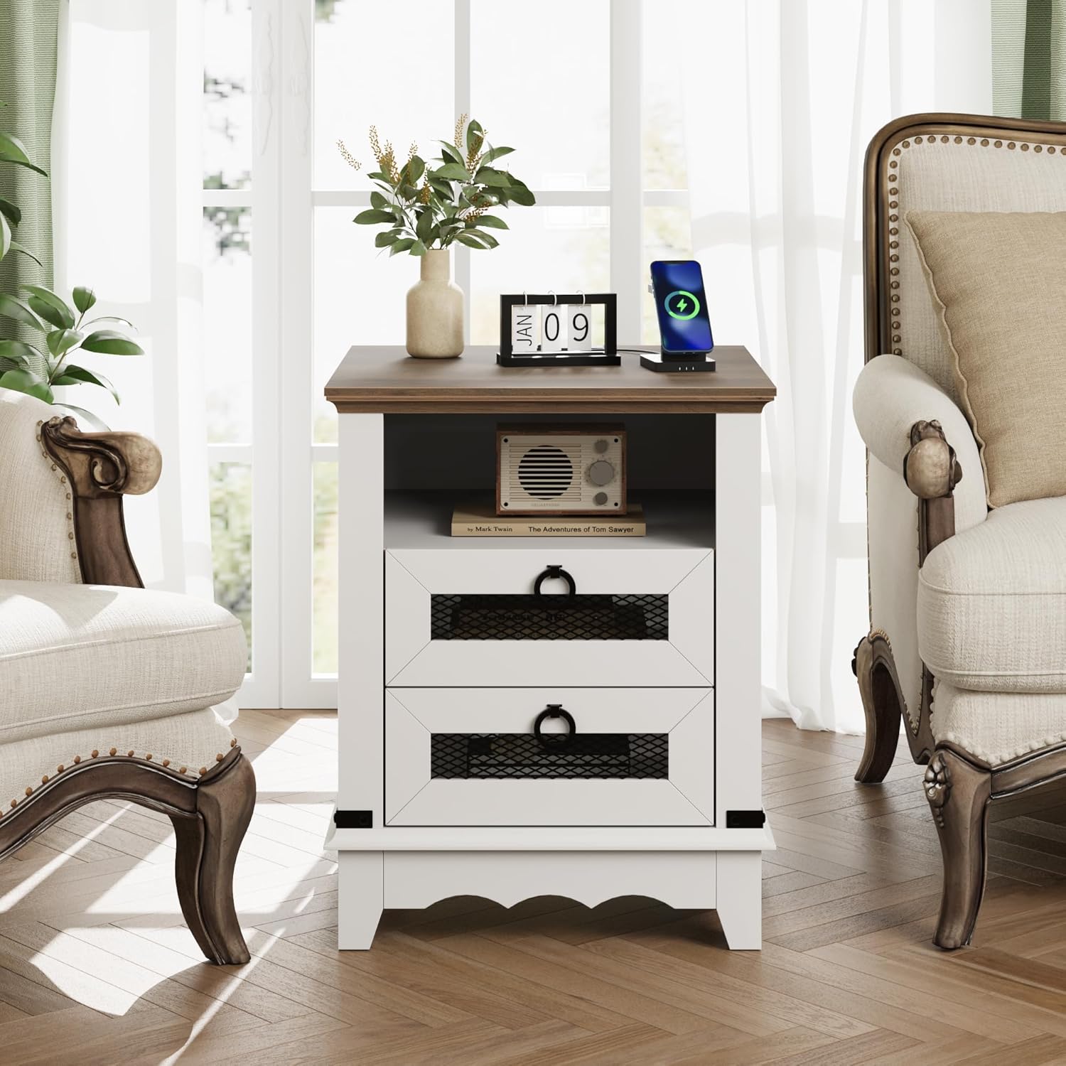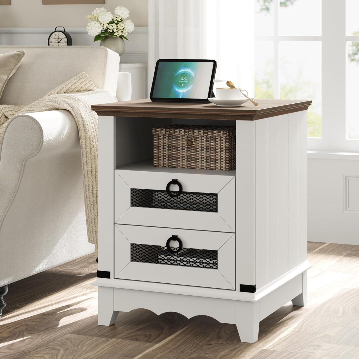 IDEALHOUSE End Table Farmhouse Side Table 18" inch Nightstand Industrial End Table with Charging Station Night Stand 2 Drawers Bed Side Table Open Cubby Wood Sofa Side Table for Living Room Bedroom