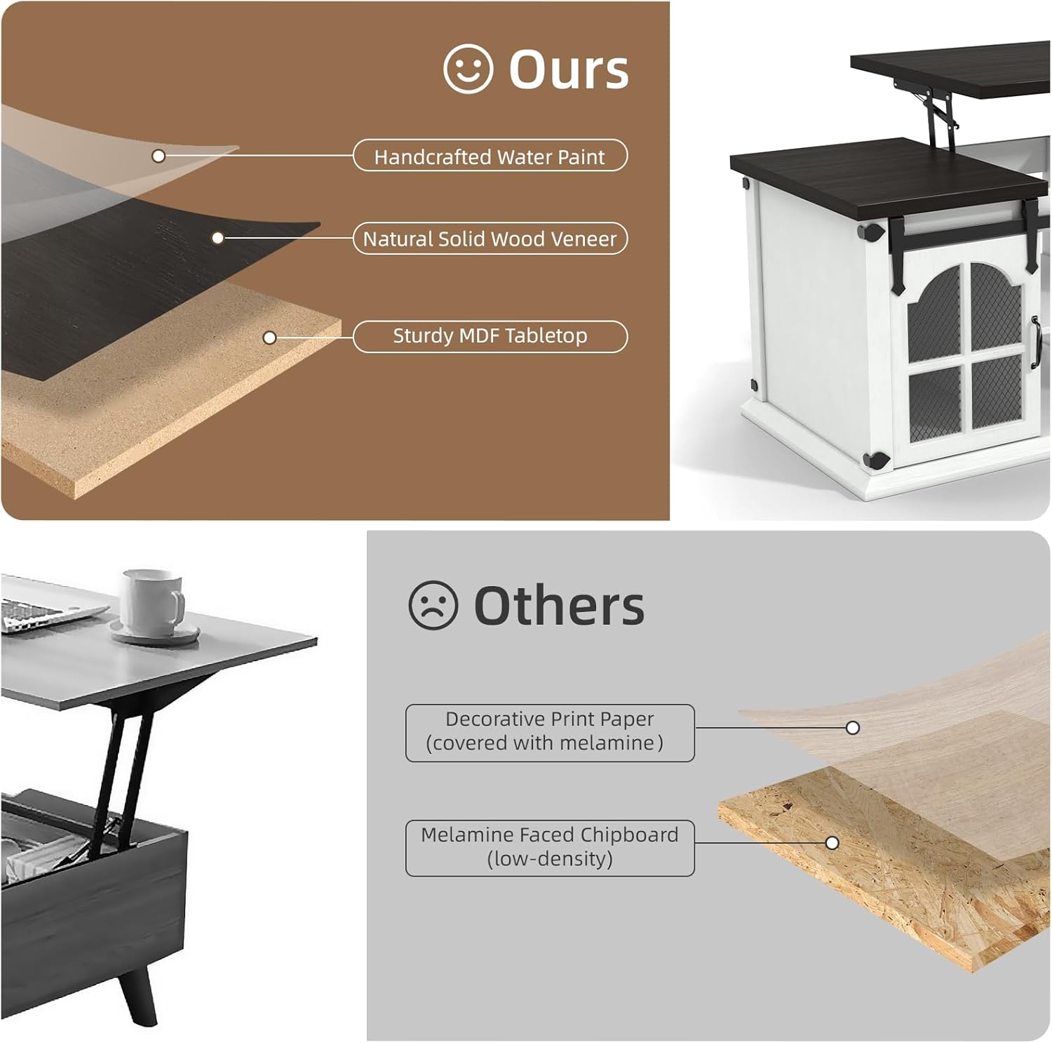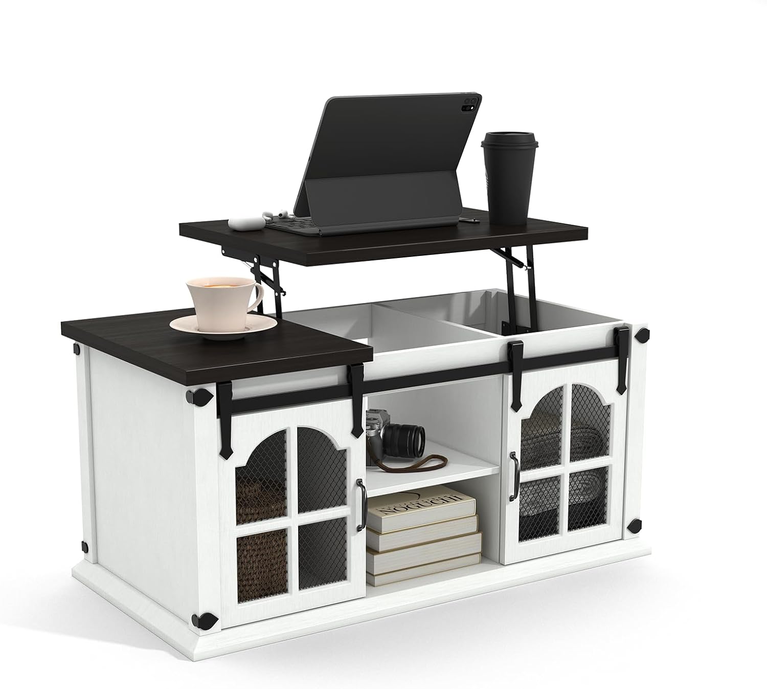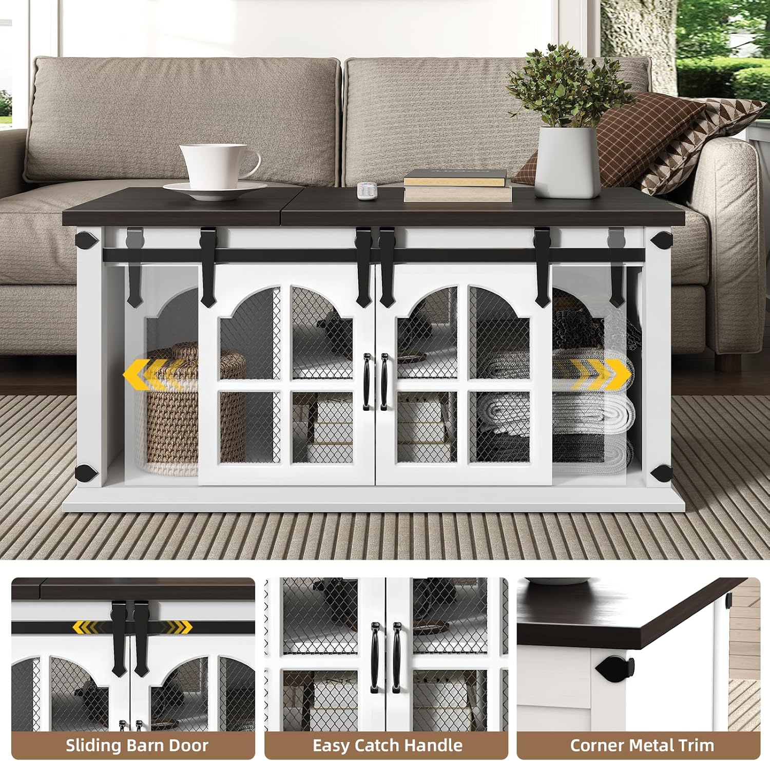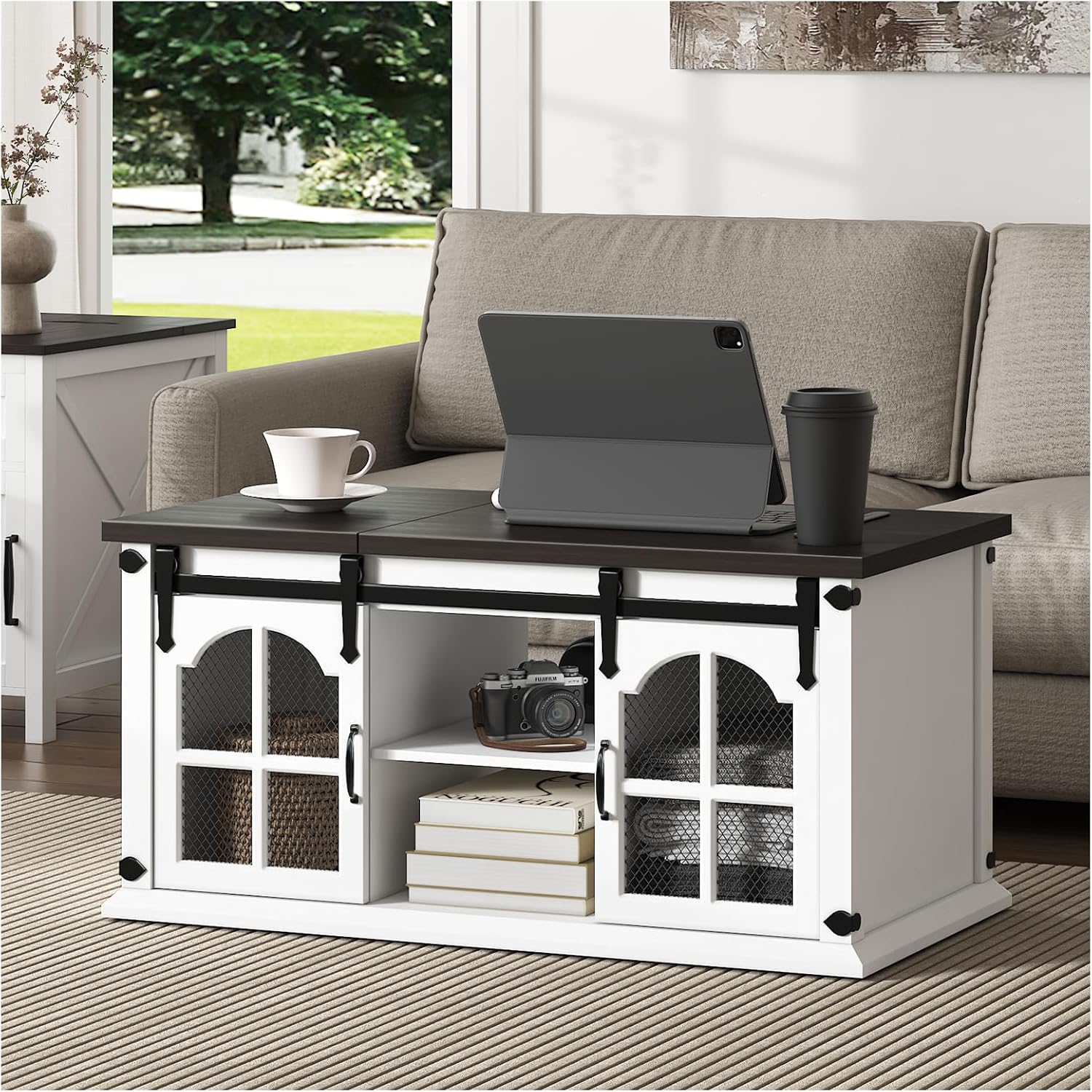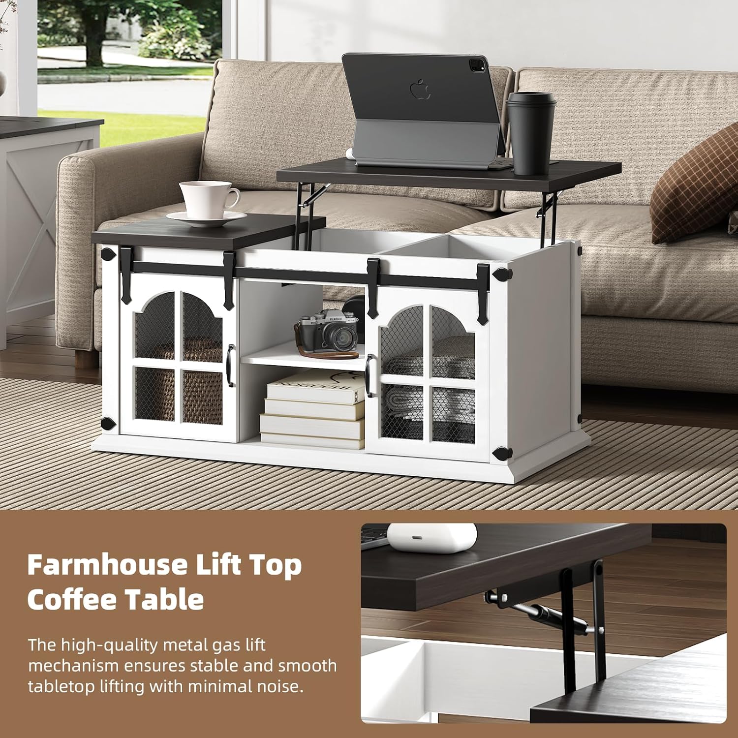 Lift Top Coffee Table with Storage,Farmhouse Coffee Table with Sliding Barn Door,Rustic Center Table with Shelves,Wood Storage Coffee Table with Lifting Top for Living Room,Office,White