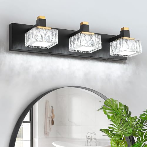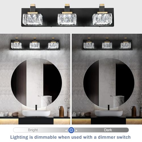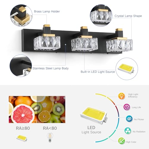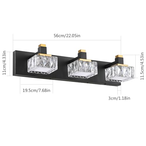 Bathroom Vanity Lights Over Mirror,3-Light Dimmable 5CCT Led Vanity Lights Black Gold Crystal Wall Sconce Lighting 22.4 inches Modern Vanity Light for Bathroom,Bedroom,Living room.(3000K-6000K)