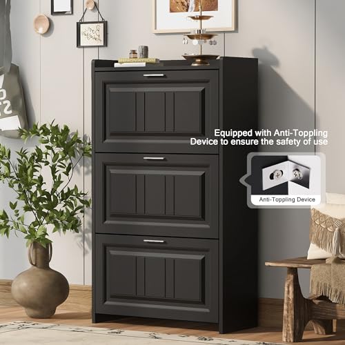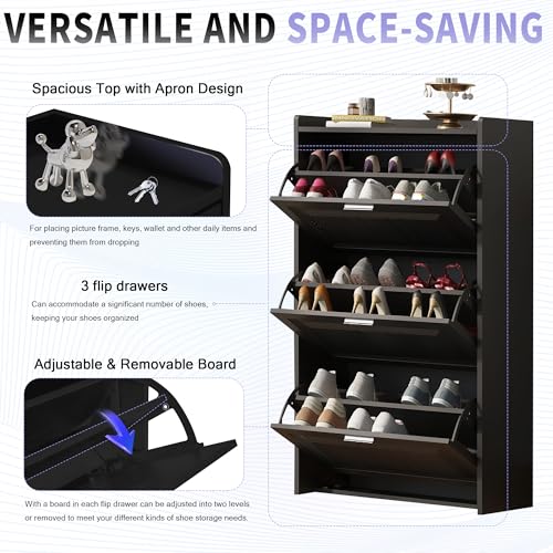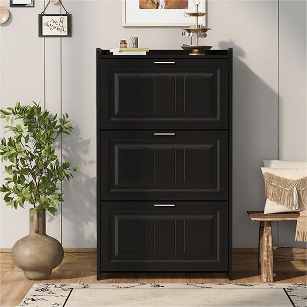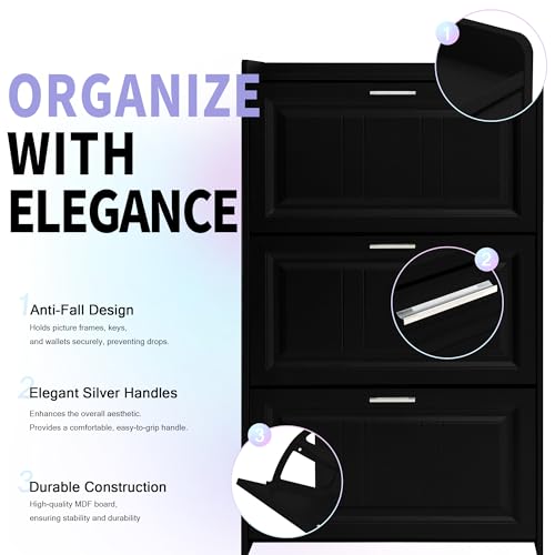 Modern Independent Shoe Cabinet with 3 flip Drawers, Space Saving Ultra-Thin Storage Box Suitable for Home entrances and Living Rooms (Black)