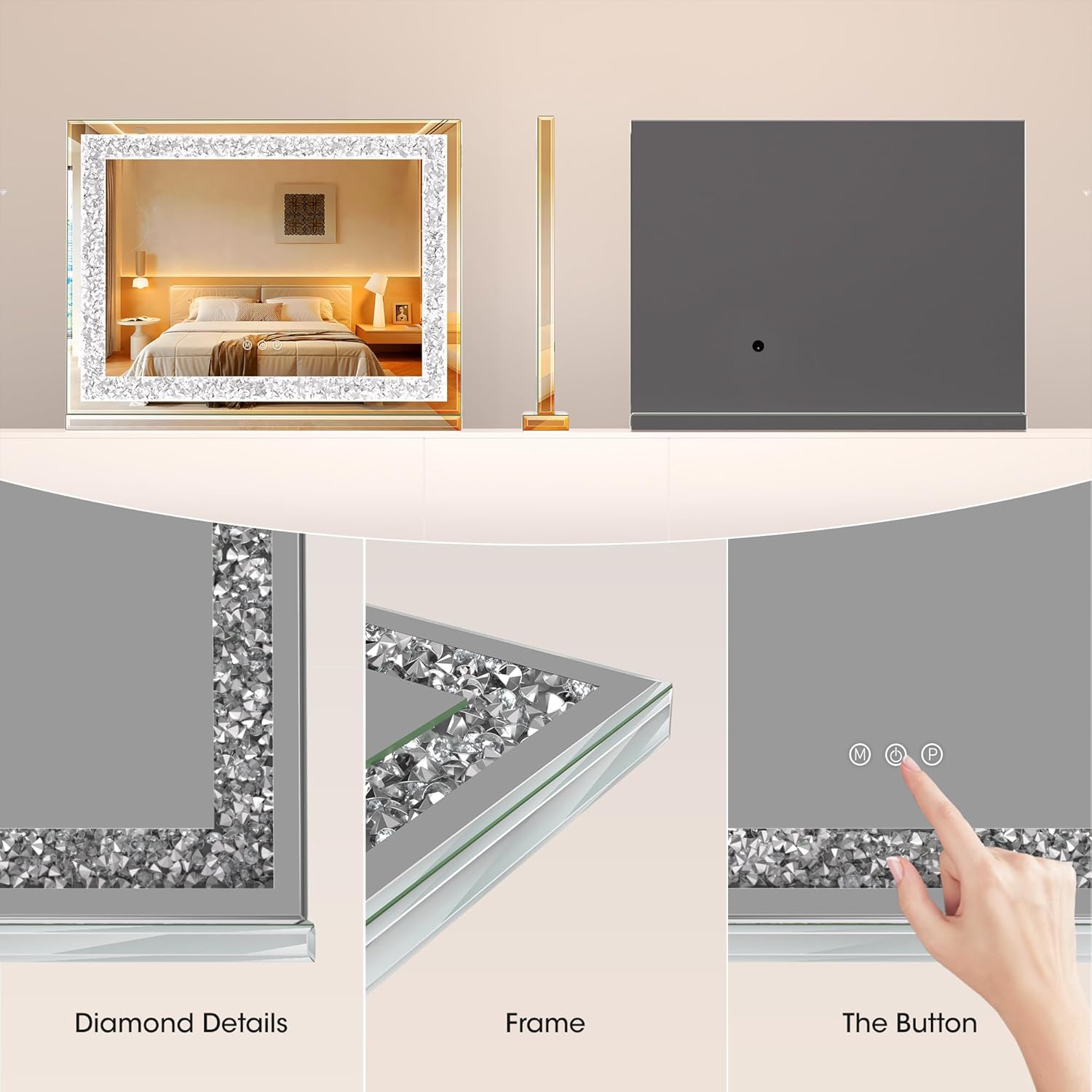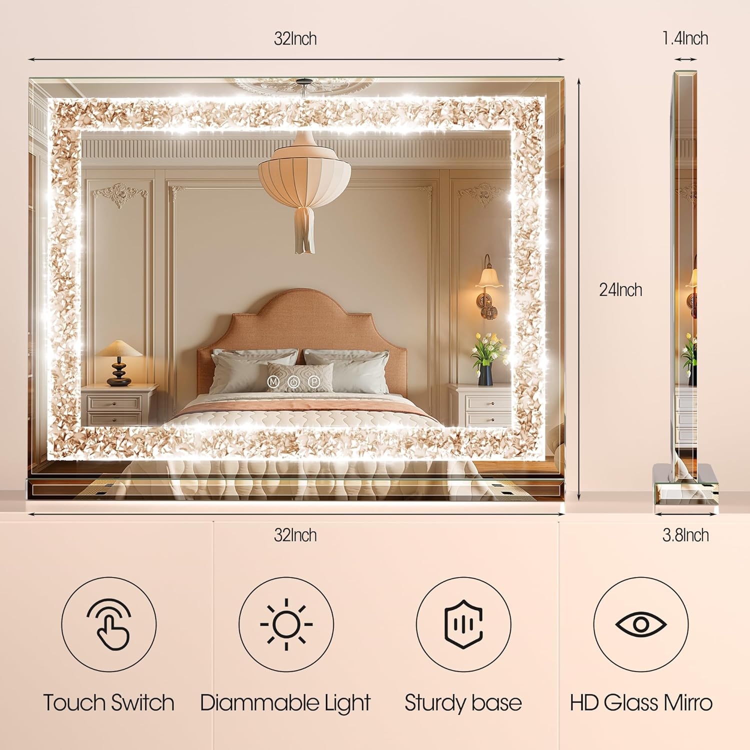 Hasipu Vanity Mirror with Lights and Crystal Diamond, 32" x 24" LED Diamond Makeup Mirror, Smart Touch 3 Colors Dimmable (Right Angle White)