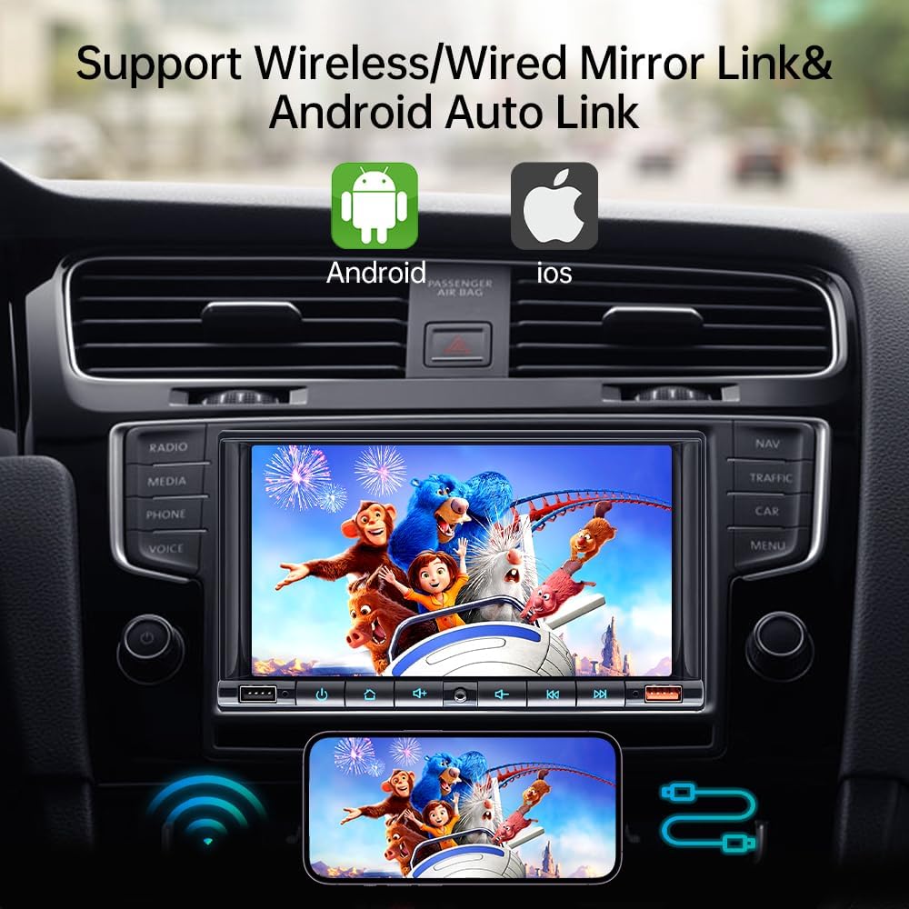 2024 Newest 7 Inch Double Din Car Stereo for Wireless Carplay&Android Auto with Voice Control,Car Radio with HD Touch Screen Bluetooth5.2, AM/FM/Mirror Link/Backup Camera/SWC/AUX/MIC/DSP