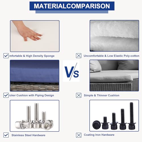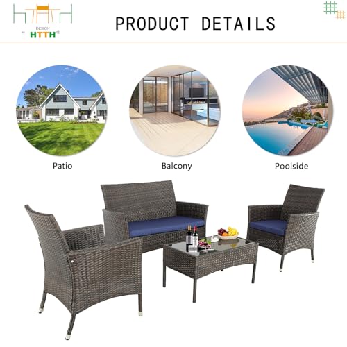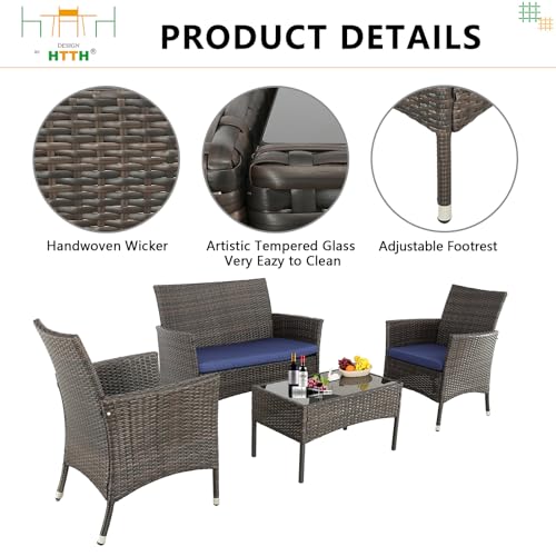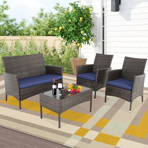 4-Piece Outdoor Patio Furniture Sets Wicker Sofa with Cushions and Coffee Table Garden Lawn Pool Backyard Outdoor Sofa Sets (Expresso Rattan- Peacock Blue, Set of 4)