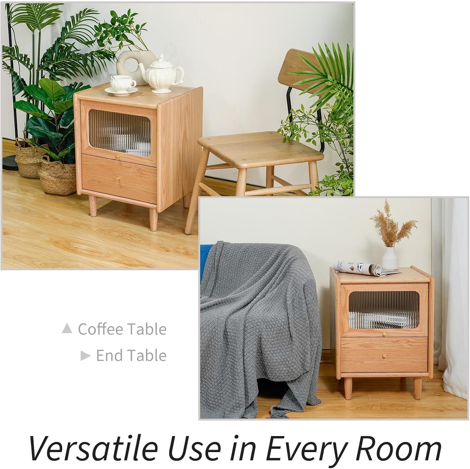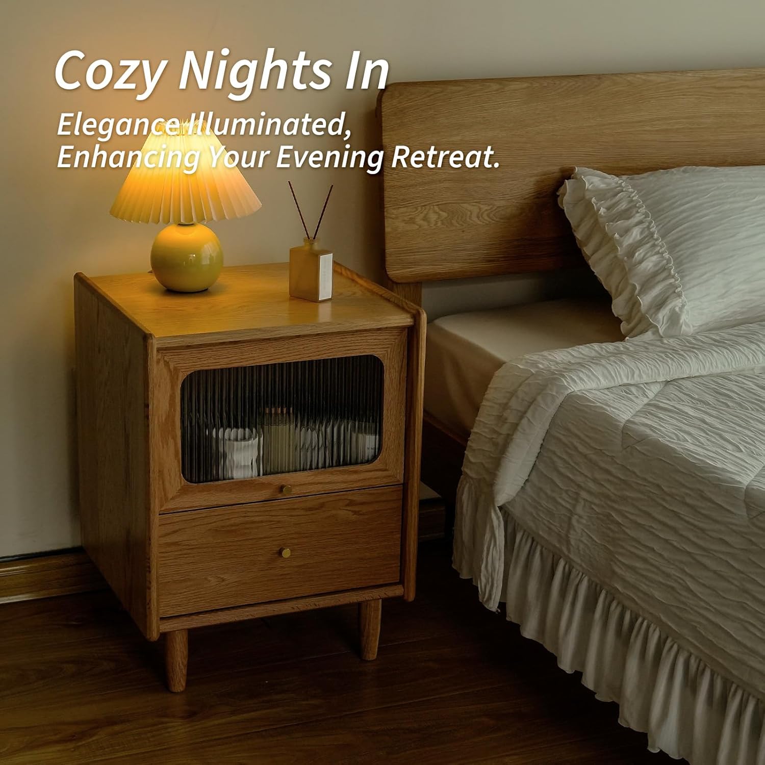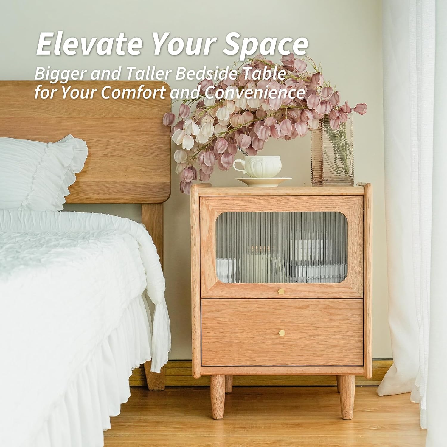 Nightstand, Oak Nightstand, Solid Wood Nightstand with Glass Drawers, Natural Wood Nightstand, Mid Century End Table, 23.62 H x 17.72 W x 15.75 D Inches
