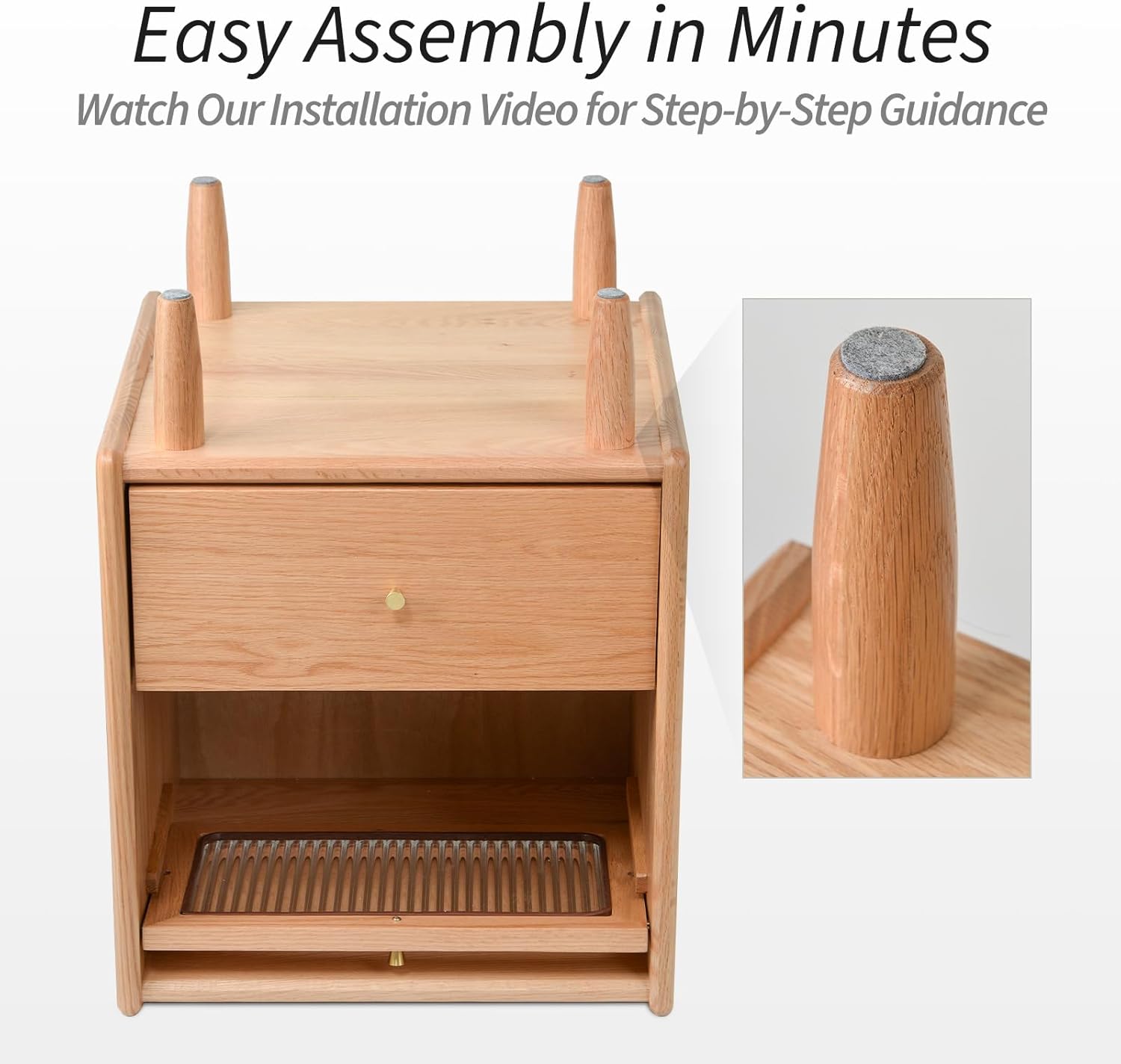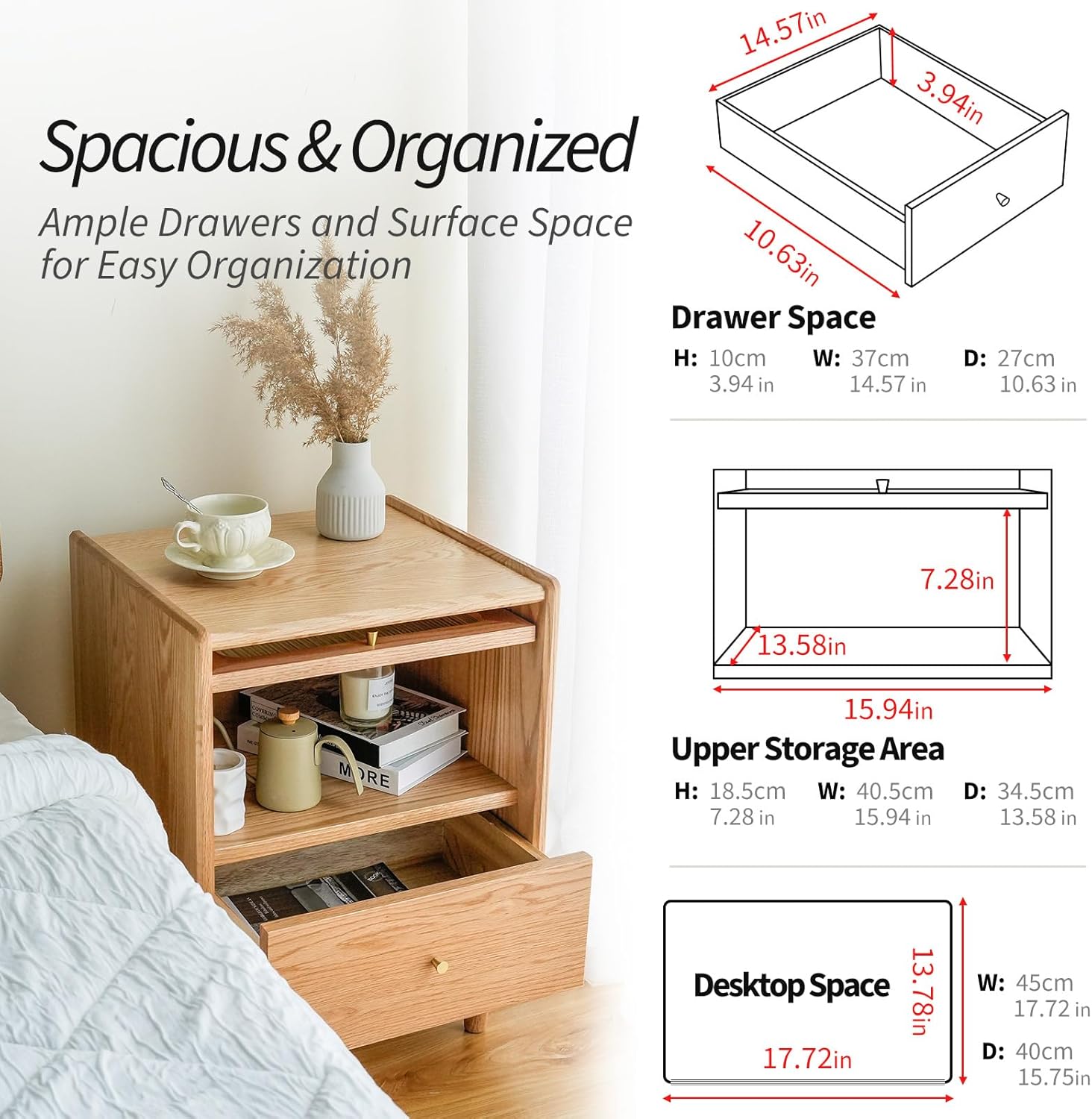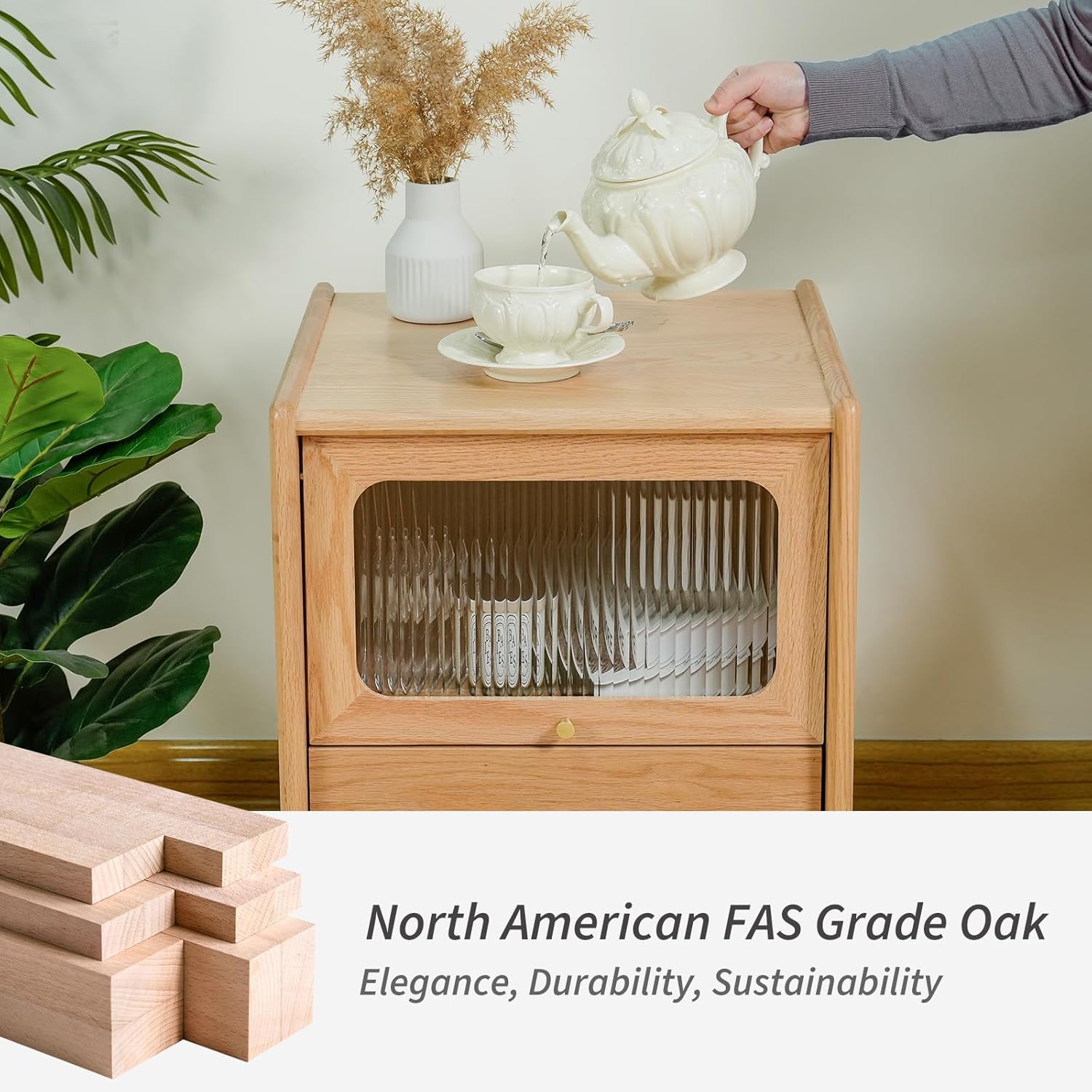 Nightstand, Oak Nightstand, Solid Wood Nightstand with Glass Drawers, Natural Wood Nightstand, Mid Century End Table, 23.62 H x 17.72 W x 15.75 D Inches