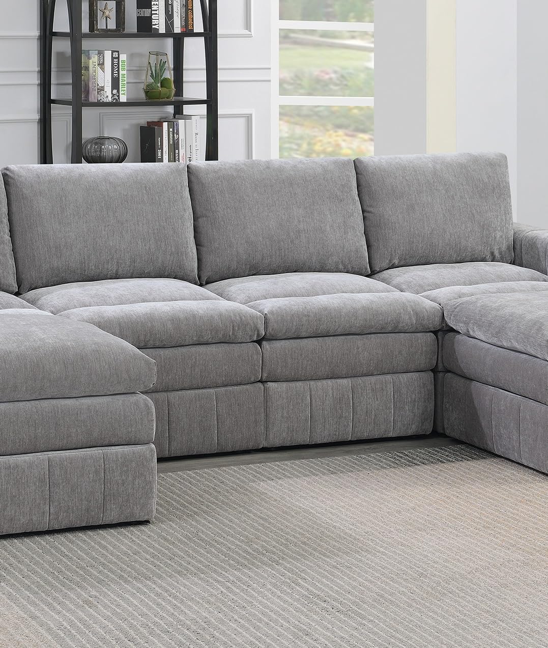 Contemporary 6pc Set Modular Sectional Set 2X One Arm Chair/Wedge 2X Armless Chairs 2X Ottomans Granite Color Morgan Fabric Plush Living Room Furniture
