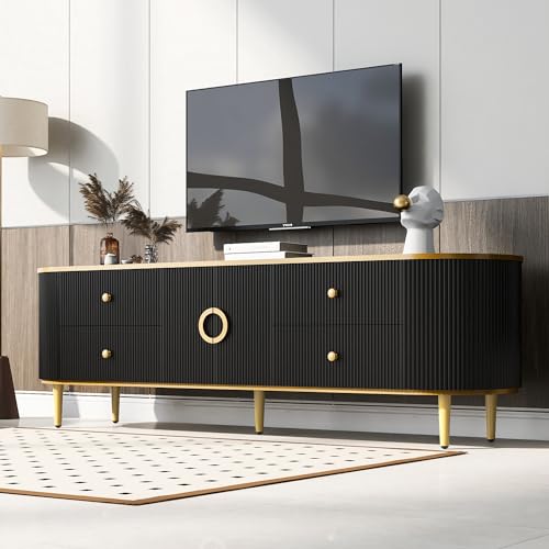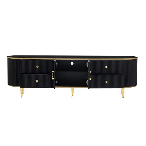 SSLine Luxury 70.9" Fluted TV Stand Modern Entertainment Center for TVs Up to 80 inches, TV Console Table with 4 Drawers and 1 Cabinet, Golden Legs and Handles Media Console for Living Room (Black)