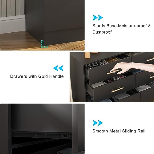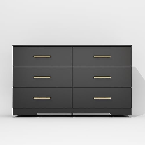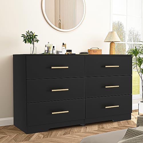 Vibe & Dine White Dresser 6 Drawer, Wooden Dressers & Chests of Drawers with Gold Handles, Modern Double Dresser for Bedroom